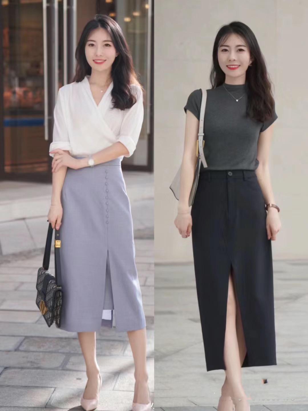 日常通勤穿搭,這種修身的小飛袖T恤來搭配高腰的開叉半身裙,也成爲一種新的時尚。適當的露膚度,更增強了時尚感。搭配開叉的半身裙,特別顯腿長。