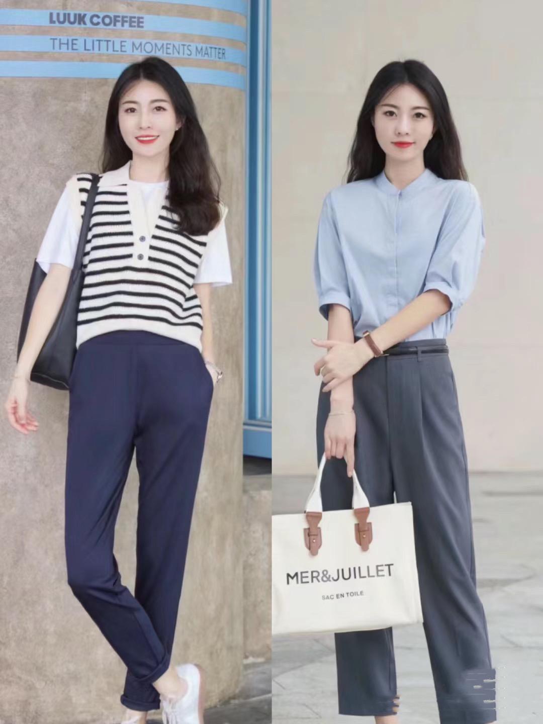以白色T恤作爲內搭,配上經典的條紋馬甲,可以表現出更加時髦洋氣的美。寬鬆的白色T恤舒適度更強,配高腰的錐形褲,簡單大氣。