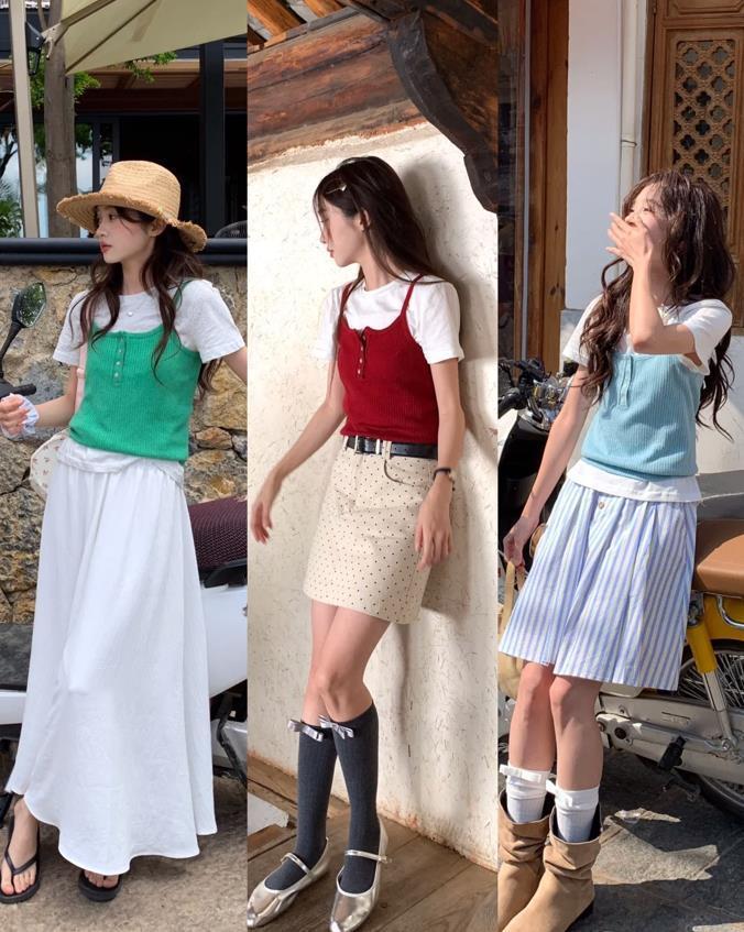 這麼一件針織背心,在搭配上也有着許多的可能,你可以試着與短袖t恤疊穿,打造出層次感,也可以配連衣裙,配短褲等,清爽涼快又能打造大長腿。