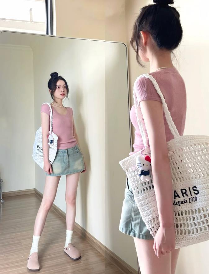 在搭配上,穿針織短袖可以配牛仔褲、短褲,以及半身裙等,如果你比較喜歡休閒一點的風格,那麼可以搭配一條寬鬆牛仔褲、運動鞋,若是想打造優雅氣質一點的風格,那麼配一條半身裙就可以。