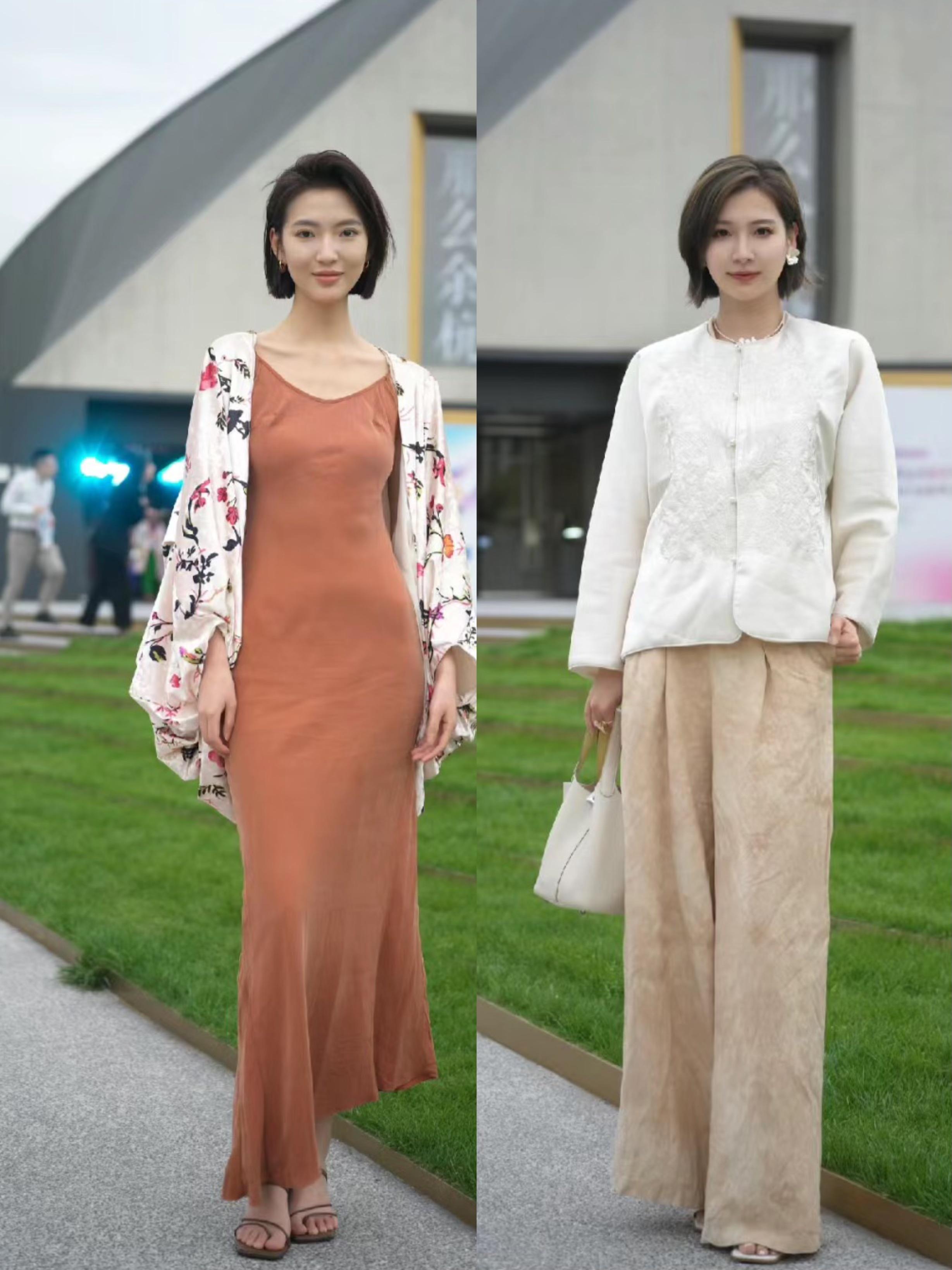 穿上國風服裝的杭州美人,更是把東方女性的婉約與高級自然呈現。比如緞面提花的過剩上衣,搭配國風闊腿褲,簡單又貴氣。