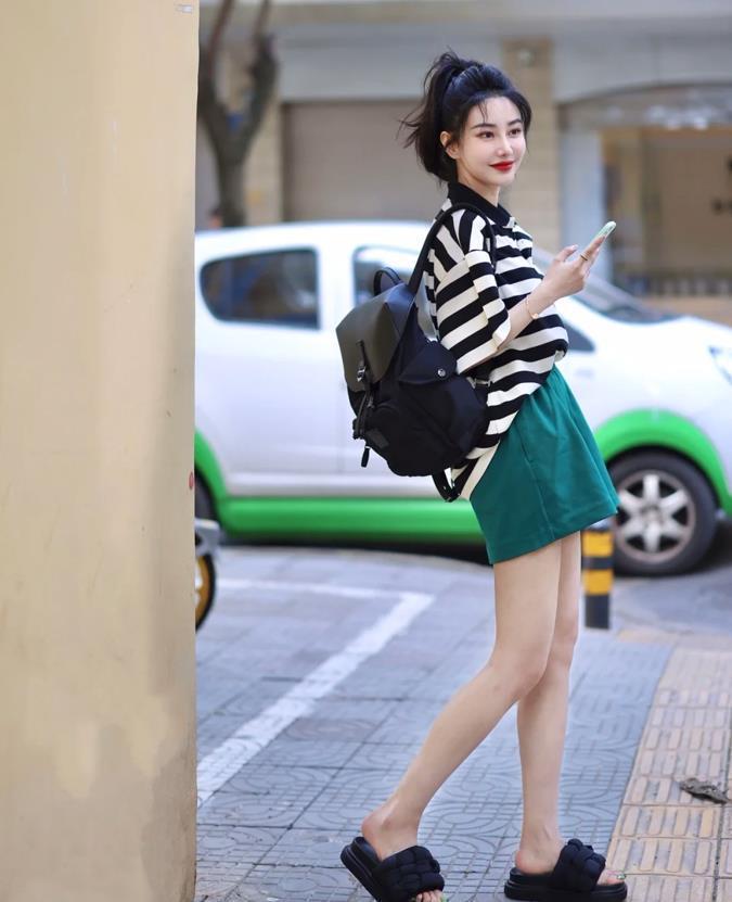韓系元氣範滿滿的穿搭,整個着裝打扮看起來很休閒,條紋t恤+綠色寬鬆短褲,出門簡單踩着一雙涼拖鞋就行了,很清爽時髦又耐看。