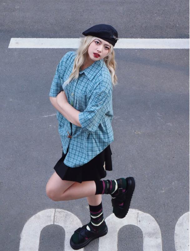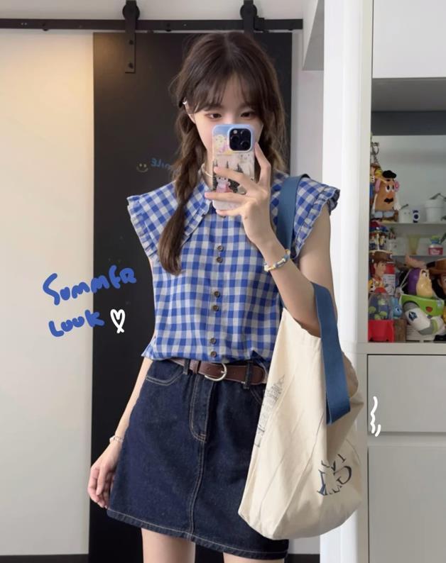 不喜歡傳統款式襯衫的話,可以嘗試下這種設計感的襯衫,格子襯衫,自帶一種復古範氣息,小飛袖+大翻領的設計,很減齡。簡單配一條牛仔半身短裙,少女範十足。