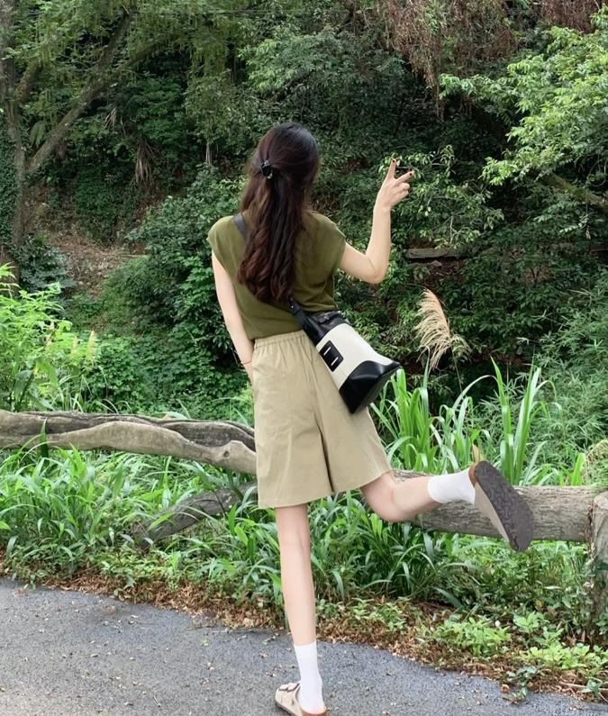 很簡單的一套出門穿搭,墨綠色短袖t恤,比起經典白t,這個顏色莫名帶着幾分復古與小清新的氣息。選擇一條卡其色五分短褲來配,寬鬆的褲型襯托下,穿得舒適自在又顯瘦。
