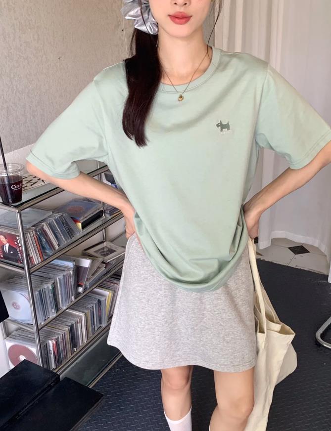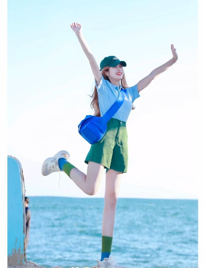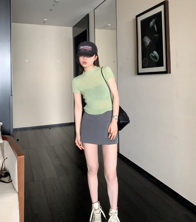 薄荷曼波綠色,實在是太顯清新感了,短袖和夏天真的超配的,加上薄荷綠這個顏色,一整個清新和顯白,上身就是帶着清涼感。下裝與一條灰色運動半裙相配,簡單舒適又幹淨。