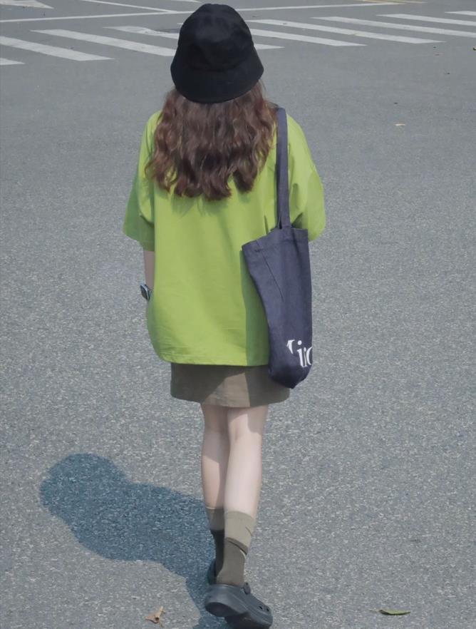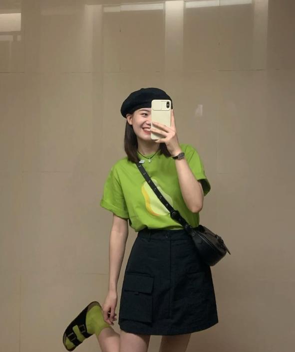 在春夏季節,對於綠色真的沒有一點抵抗力,出門穿上這麼一件綠色t恤,就如同行走的“顯眼包”,太亮眼吸睛了。選擇黑色半身短裙相配,綠色+黑色的配色,時髦且高級。