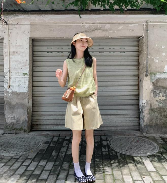 青蘋果綠真的太有夏天的氣息了,結合簡約的t恤,輕鬆就穿出時髦的夏日造型,記得T恤的版型選擇寬鬆一些,這樣不僅給足了身材包容性,也藏肉顯瘦。搭配各種下裝都好看。