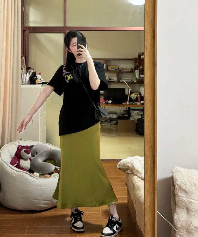 總有姐妹覺得綠色系很難駕馭,對於這種情況,你就可以爲自己選擇一條綠色的下裝,比如這麼一條綠色半身長裙,緞面材質,舒適又涼快。