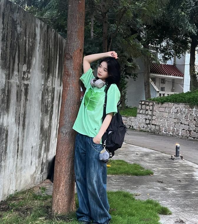 今年夏天那麼流行穿綠色,你又怎能錯過呢?給自己來一件綠色t恤吧,這件是青蘋果綠色,穿上顯得整個人都很精神。搭配一條闊腿牛仔長褲,一整套都是鬆弛感,很隨性自在。
