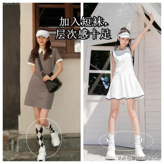 選擇運動短裙後,我們可以通過利用搭配短襪來增加吸睛度。選擇合適的短襪不僅可以拉長雙腿線條,增加整體比例感。同時還可以選擇不同顏色、面料和圖案的短襪,爲穿搭增添多樣化與趣味性。