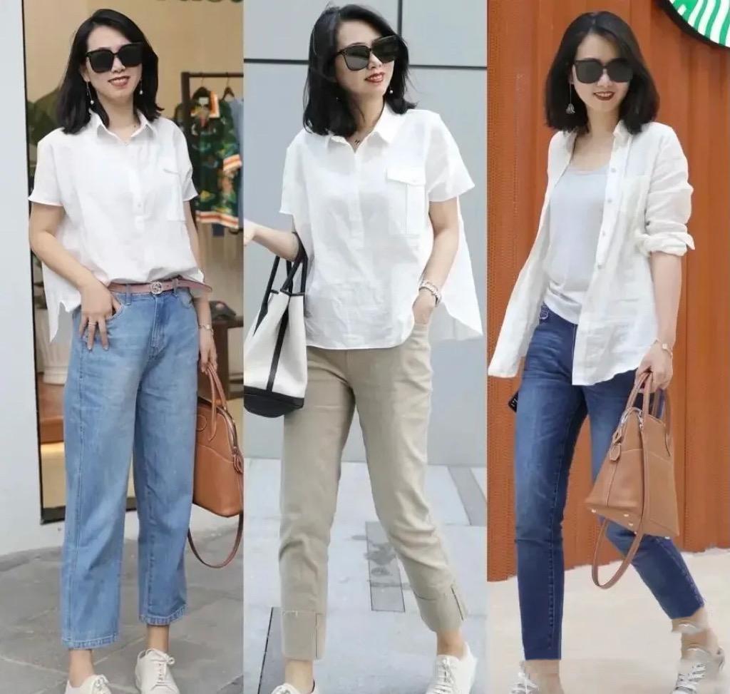 看似基礎款的白襯衫,我們可以選擇前短後長的設計。用白襯衫來搭配高腰的直筒牛仔褲,簡簡單單就舒適體面,九分牛仔褲的搭配,也更加輕便顯腿長。