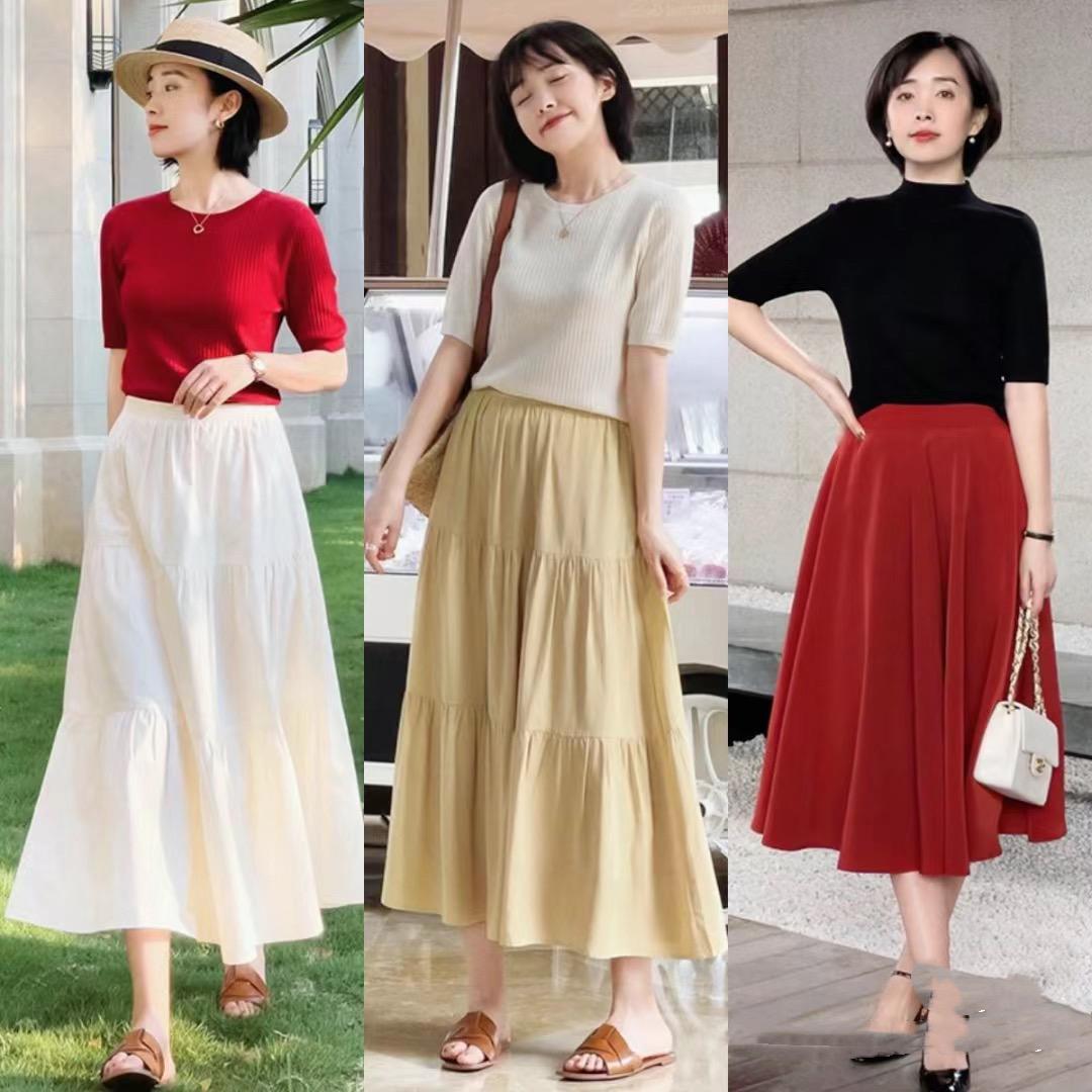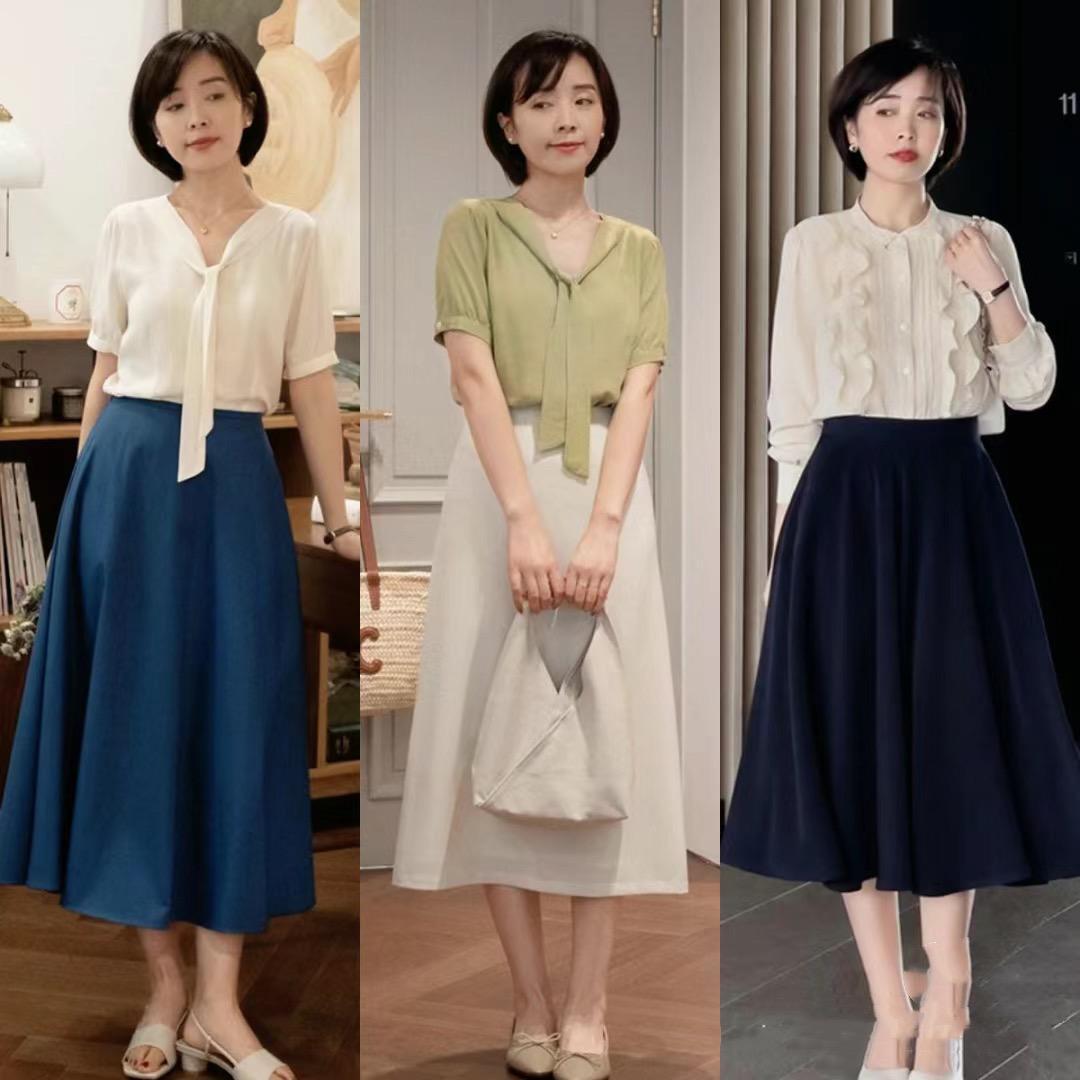 像這種高腰的半身傘裙,儘量配棉麻的材質,舒適透氣又帶有一定的挺闊型。如果以蛋糕裙的剪裁來裝飾,還可以表現出更強的減齡效果。