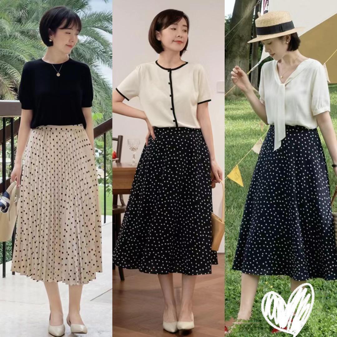 以波點元素的點綴,塑造出半身裙的優雅浪漫,也是夏天裏最體面的穿搭。40+的女性,如果喜歡這種簡約清爽的穿搭,可以嘗試冰絲上衣+波點半身裙的組合。