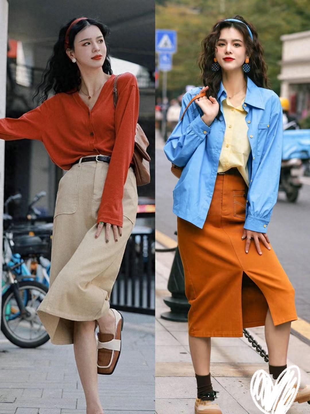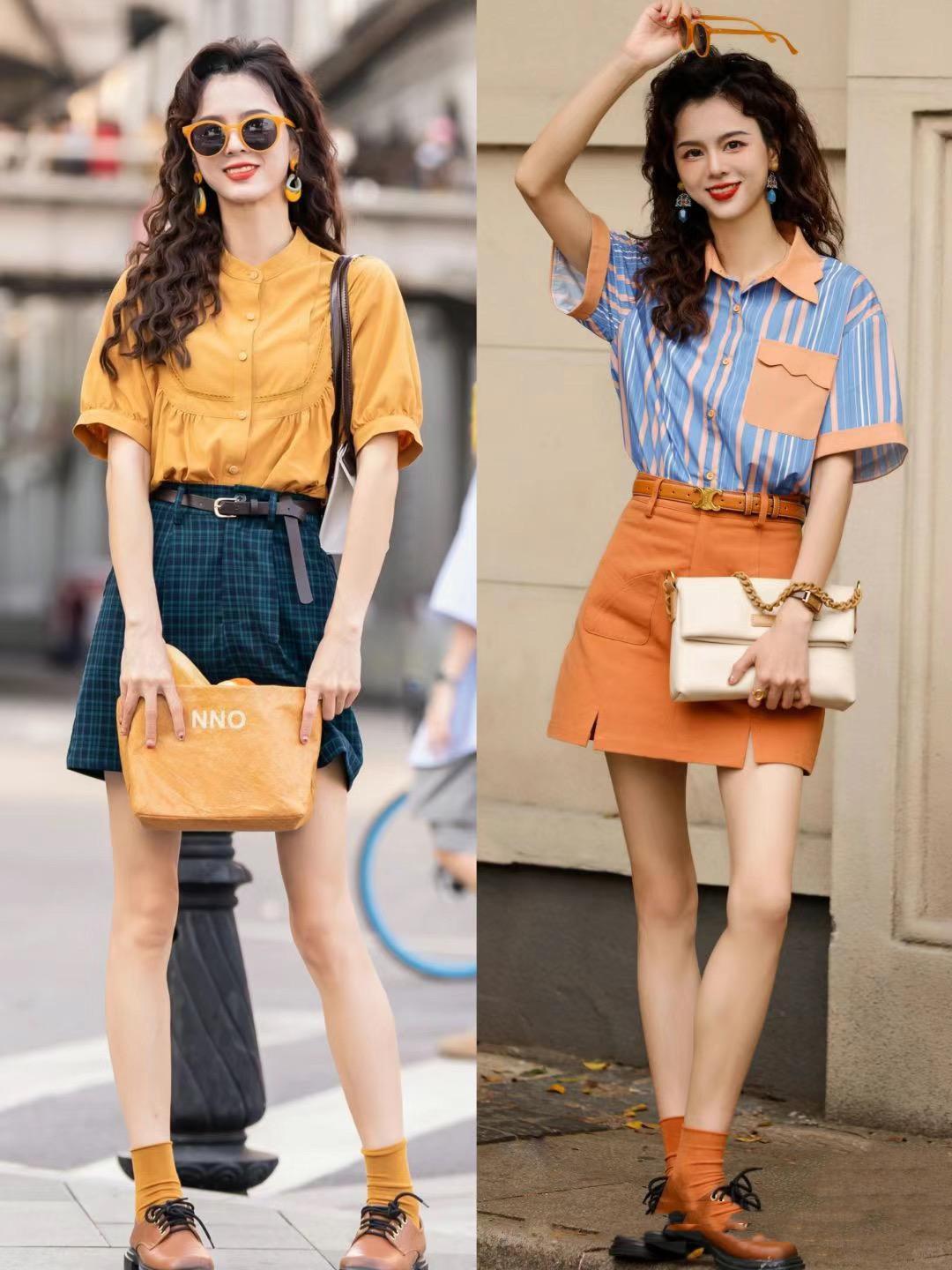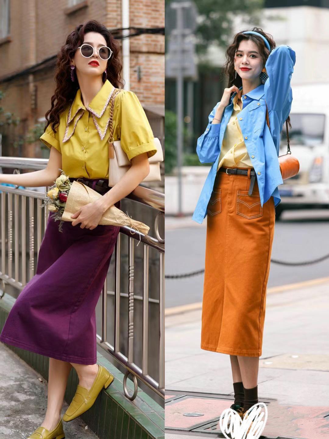 以牛仔襯衫來搭配橘色的半身裙,這種配色高級醒目。反差感比較大的配色,也格外提氣質。而且復古風的牛仔襯衫,穿起來顯白又耐看,自帶高級氣場。