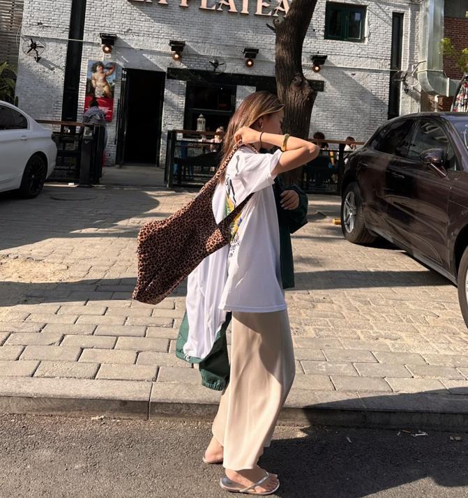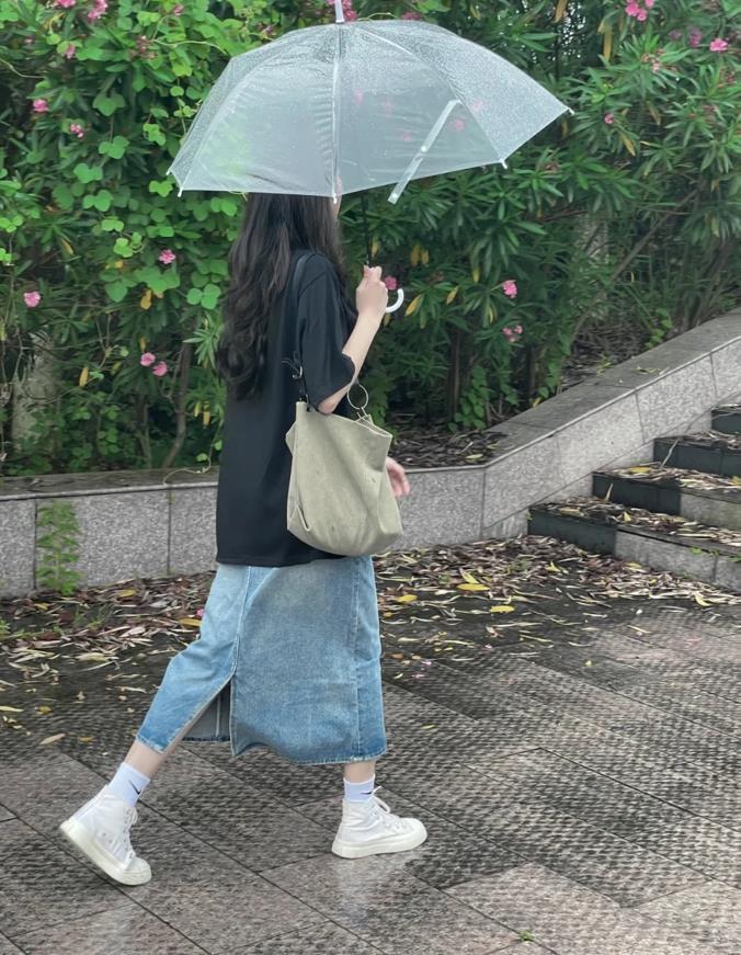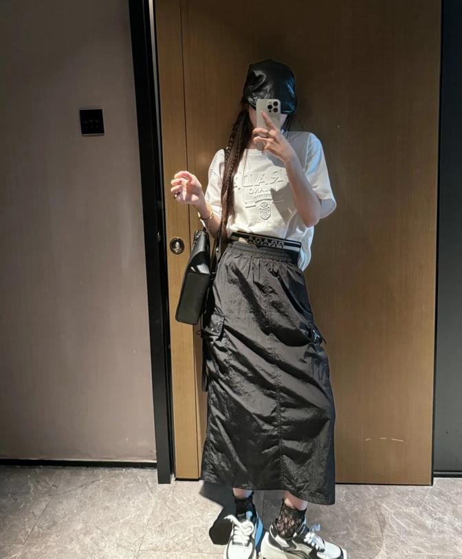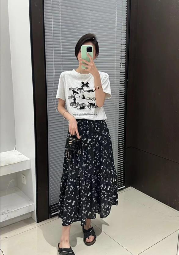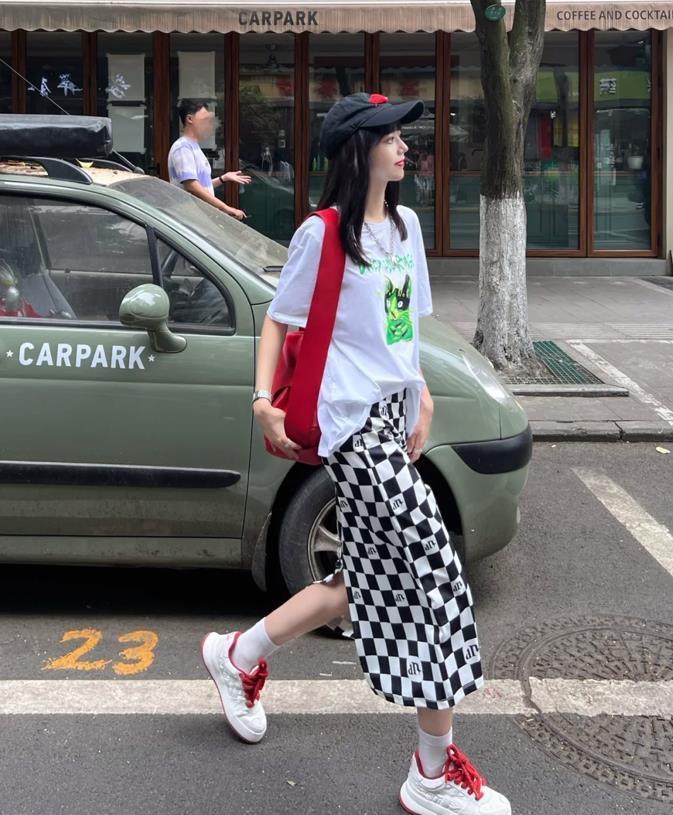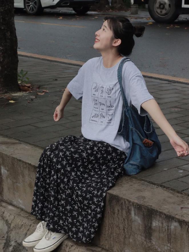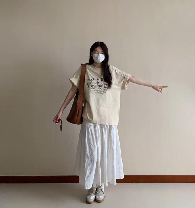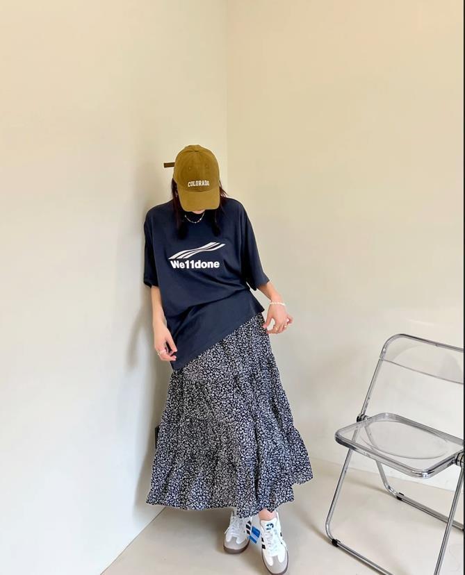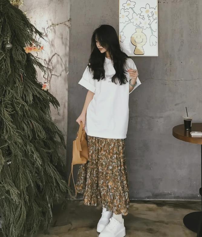 T恤的簡約與花哨的半身裙形成了鮮明的對比,t恤的款式是比較多的,有基礎的白色、黑色還有灰色,你也可以選擇帶印花、字母圖案的款式,根據自己的喜好去選擇就好。至於版型上,有寬鬆的,緊身的,根據自己身材來入手就可以。