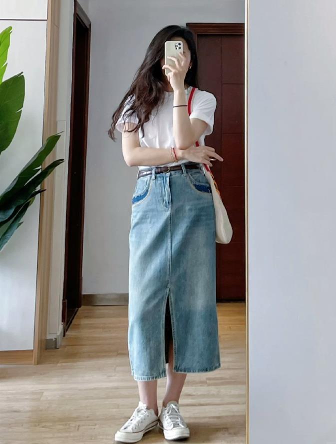 而牛仔半裙,款式也是比較多的,有直筒、a字版型等,可以根據自己的身材情況進行挑選,對於下身比例較好的姐妹,不管是緊身的,還是直筒的都是可以輕鬆駕馭的。