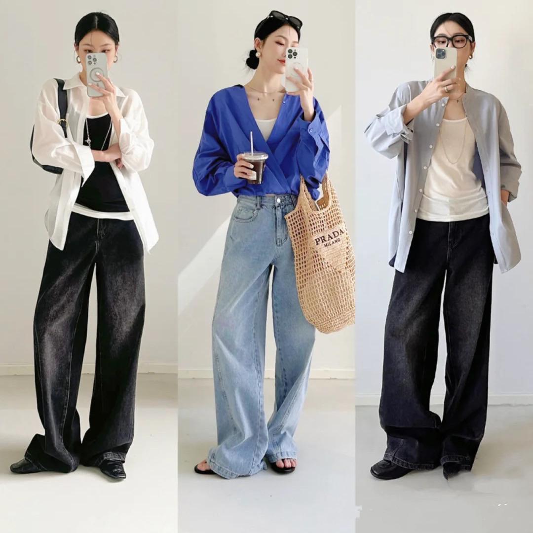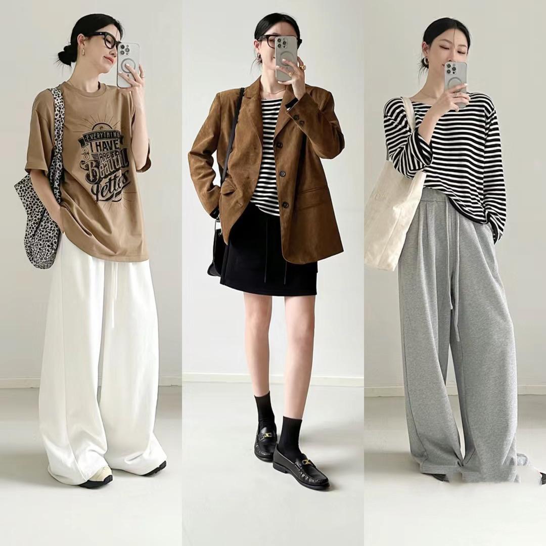 比如寬鬆的字母印花T恤、或者條紋T恤、卡通T恤,都可以搭配高腰的闊腿褲來穿着。寬鬆T恤只需要選擇一種不好好穿衣的方式,塞個衣角就可以表現出優越的比例感。