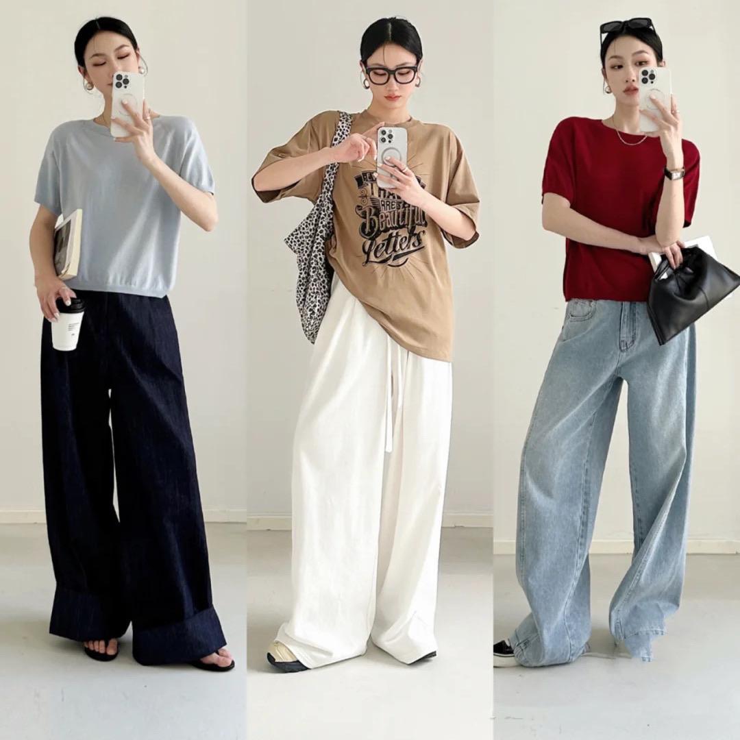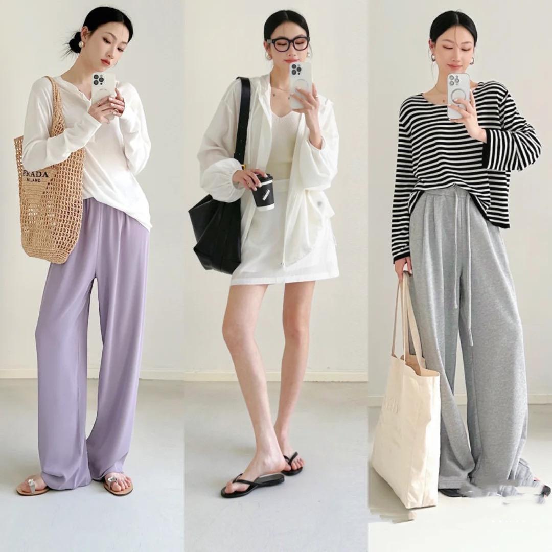 比如寬鬆的T恤,我們可以搭配冰絲或者速乾的面料,配高腰的直筒褲或者闊腿褲來穿着,簡簡單單的搭配,就更加清爽洋氣,有一種人在衣中晃的感覺,時髦且顯瘦。