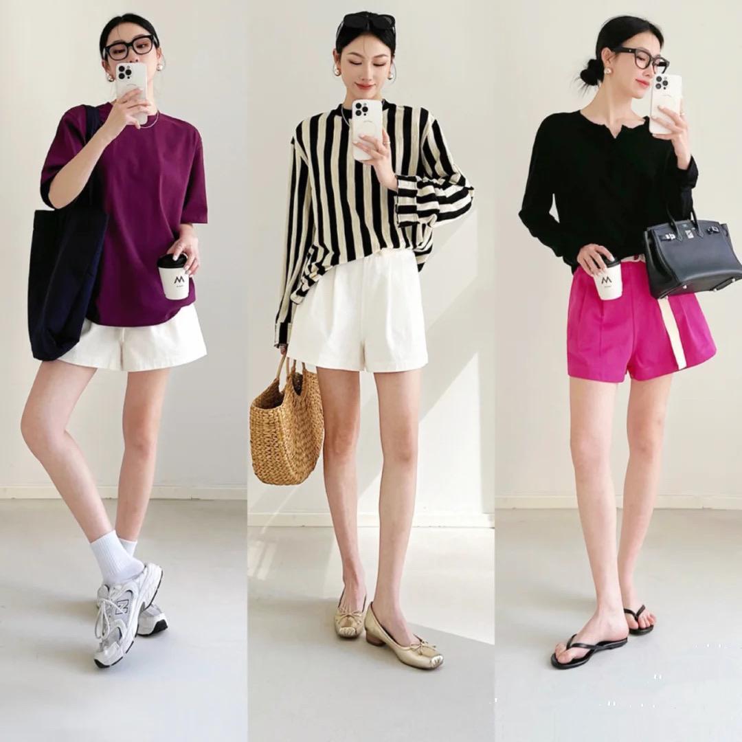 高腰的A字形短褲,我們可以搭配一種相對挺闊的面料,整體舒適性更強一些。流暢的剪裁,可以顯得雙腿線條更加挺拔,配寬鬆的罩衫更加大氣。