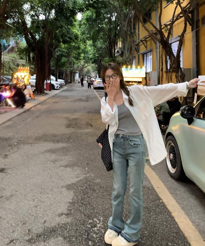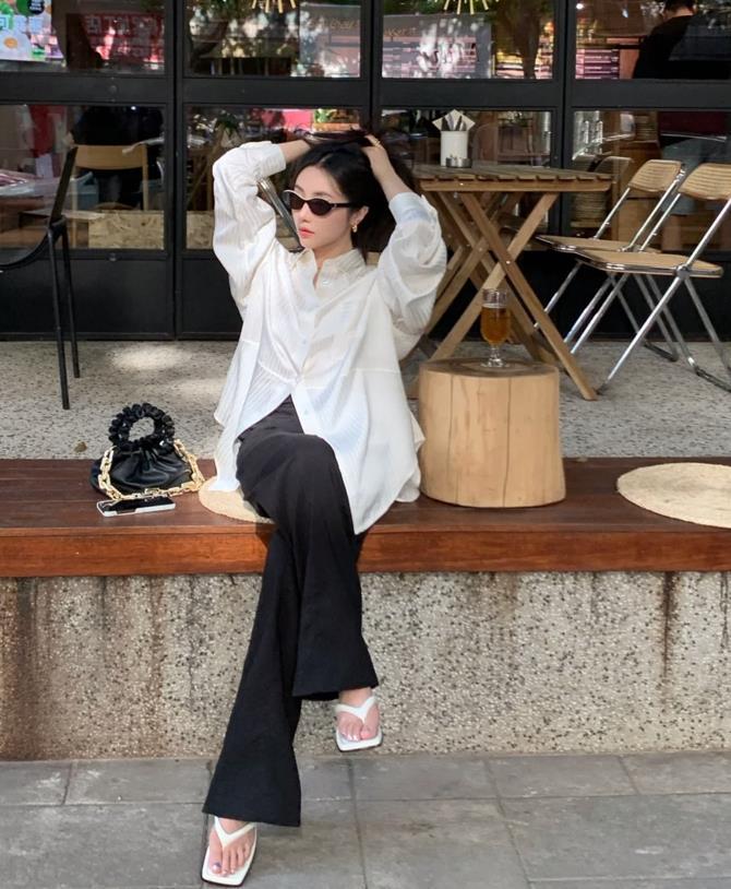 襯衫和微喇褲的組合,就是非常顯氣質的,在春夏季節,襯衫的穿法也比較多,既可以單穿,又能進行疊穿。在裏面加上一件t恤或背心,就很時髦,爲整個造型增加了層次感。
