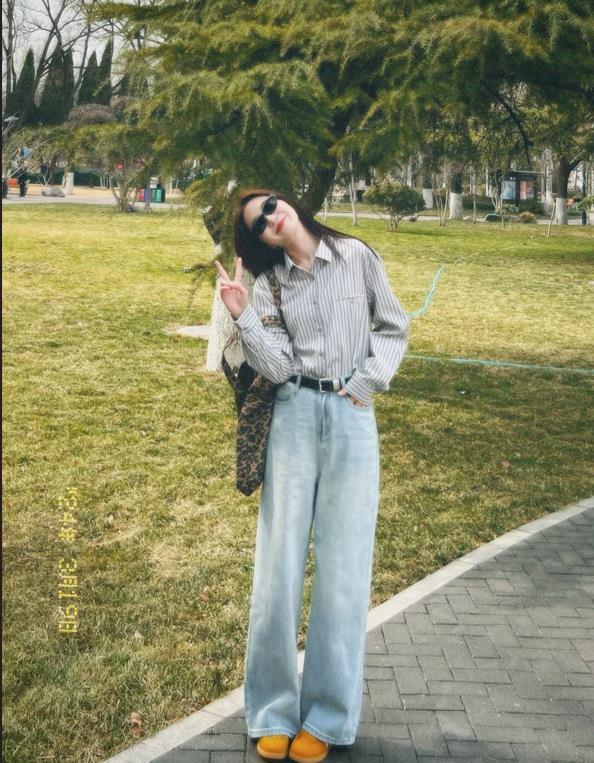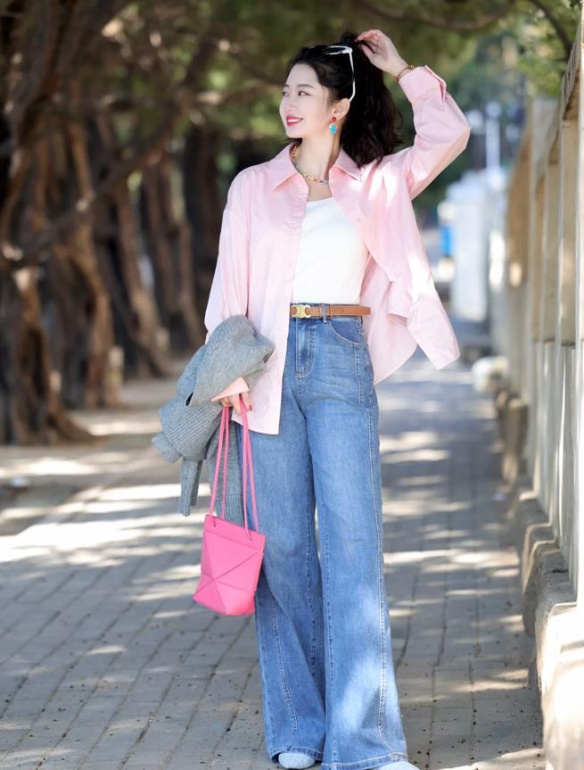 牛仔褲的款式也是比較多的,姐妹們最好可以根據自己的身材情況進行挑選,直筒、闊腿和微喇這幾個版型,都是比較常見的,也深受衆多女性們的追求。穿起來不僅顯瘦還能對腿型進行修飾。與襯衫的搭配,自然也是非常好看的啦。