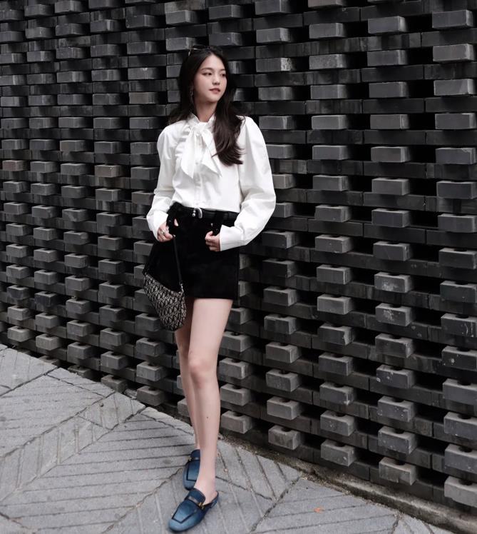 這一套適合上班通勤、休閒的穿搭,主打的就是一個舒適,黑色穆勒鞋,真的是超級又百搭的,平底的設計,穿脫都很方便舒適。白色飄帶襯衫+黑色短褲,黑白配就是最耐看時髦的,適合懶人出街的造型。