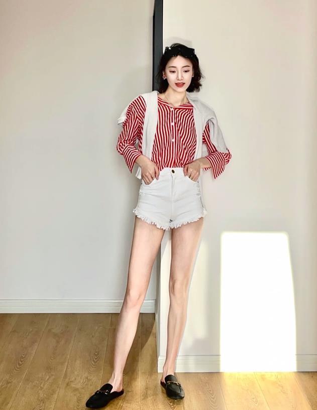 不管是高個子,還是小個子都很合適的一套,紅白條紋襯衫+白色牛仔短褲,一簡一繁的組合,很顯層次又時髦。黑色樂福鞋的搭配,讓整個造型多了幾分法式的鬆弛感,襯衫塞進褲子裏面,將腰線提高起來,輕鬆打造出大長腿。