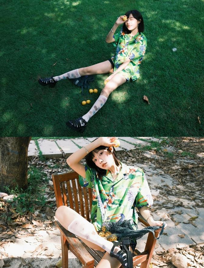 度假風滿滿的一套,很適合小個子的着裝打扮,頗有風情的一件雪紡上衣,質感和垂墜感都是極佳的,搭配白色短褲和勃肯涼拖鞋,一整個休閒和舒適自在。