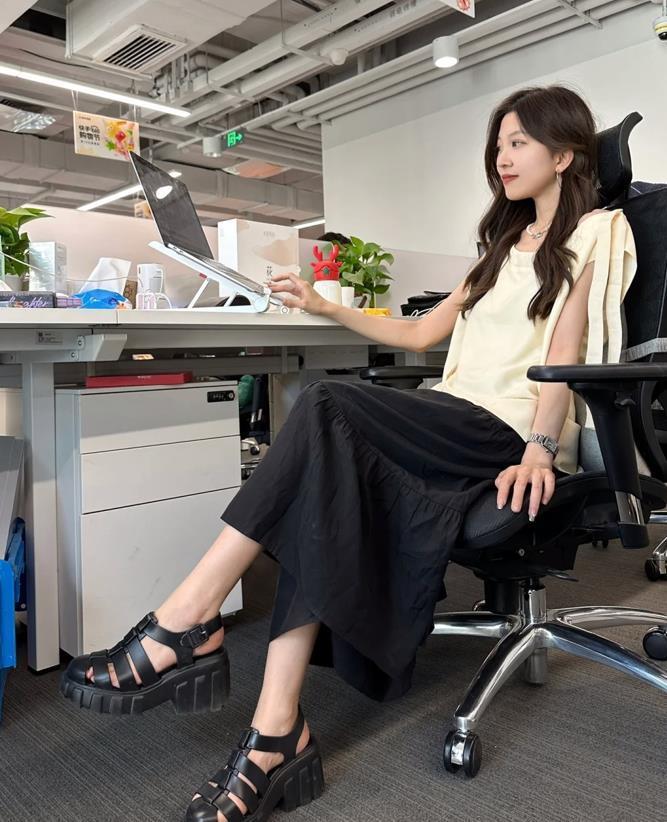 夏天的穿搭,自然是怎麼涼快怎麼來咯,齒輪厚底設計的羅馬涼鞋,還帶着一種復古的美,經典的黑色,怎麼搭配衣服都好看。