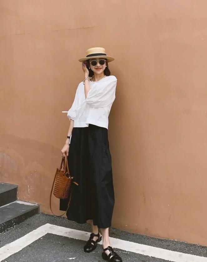 黑白配的穿搭,試問誰會不愛呢?好喜歡這種慵懶感的穿搭呢,百穿不膩,白色襯衫+黑色半身長裙,裙子的長度剛好遮過小腿肚位置,藏肉又顯瘦。還能打造出優雅和氣質,黑色羅馬涼鞋和棕色包包相互映襯,整個着裝有種法式的休閒慵懶味道。