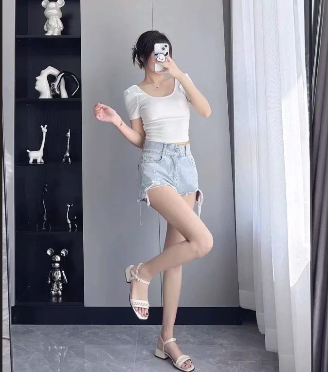 很適合小個子女生的一套穿搭,一字帶粗跟涼鞋,夏天必備的鞋款,柔軟舒適又透氣,白色短款t+牛仔短褲,就這麼將大長腿露出來,清爽涼快又在視覺上打造出高挑感。
