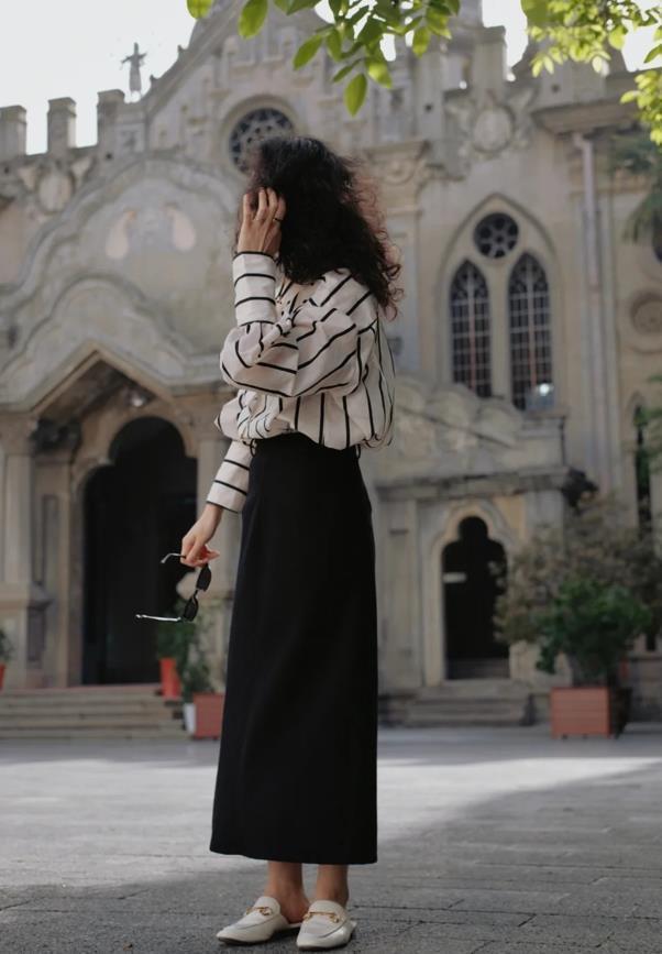 法式復古風滿滿的一套穿搭,喜歡這種風格的姐妹,就試試看吧,白色穆勒鞋,很百搭,也不失氣質感,條紋襯衫+黑色半身長裙,這種裙子版型,可藏肉顯瘦了,將腰線提高起來,很好就拉長腿部線條和比例。