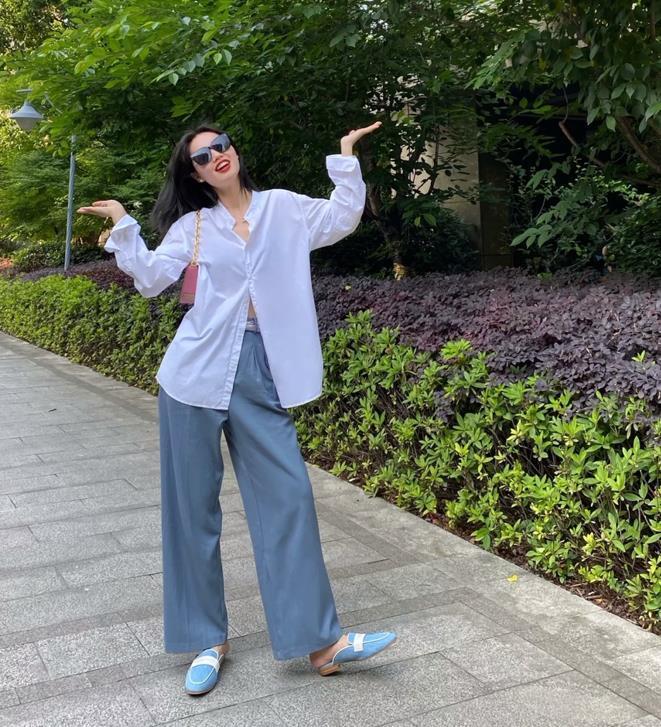 白色襯衫+藍灰色休閒西裝褲,這樣的搭配,帶着一種鬆弛感,休閒又舒適,上下裝的版型都是寬鬆的,可藏肉顯瘦了。鞋子是一雙穆勒鞋,穿脫都十分方便,整體看起來慵懶又自在。