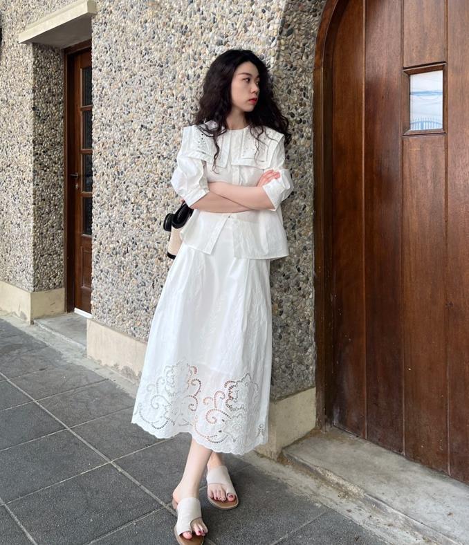 這真的是我很喜歡的穿搭,簡單大方又不失氣質,白色百褶半身裙,它的版型是真的很好,搭配黑色一字帶涼鞋,不管是上班通勤,還是逛街約會都是很合適的。