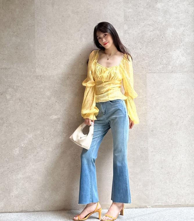 比起純色簡約款襯衫,這種法式方領泡泡袖襯衫真的太吸睛了,鵝黃色襯托下,膚色也會變得非常白皙。浪漫的碎花圖案,不僅顯甜美還減齡,搭配淺色微喇牛仔褲,舒適好穿,還顯腿直。腳下的是黃色一字帶高跟涼鞋,能讓你秒變大長腿。