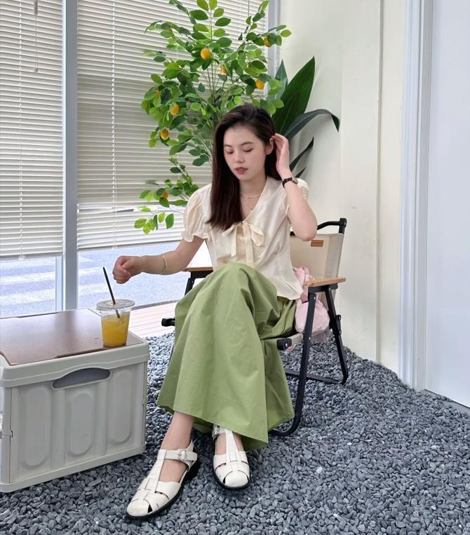 春夏季節,就是一個很適合穿裙子的時候,綠色半身長裙,充滿生機與活力,上衣搭配一件淺色的短袖襯衫,整個人看起來就非常氣質。腳下一雙白色羅馬涼鞋,穿起來舒適又自在。