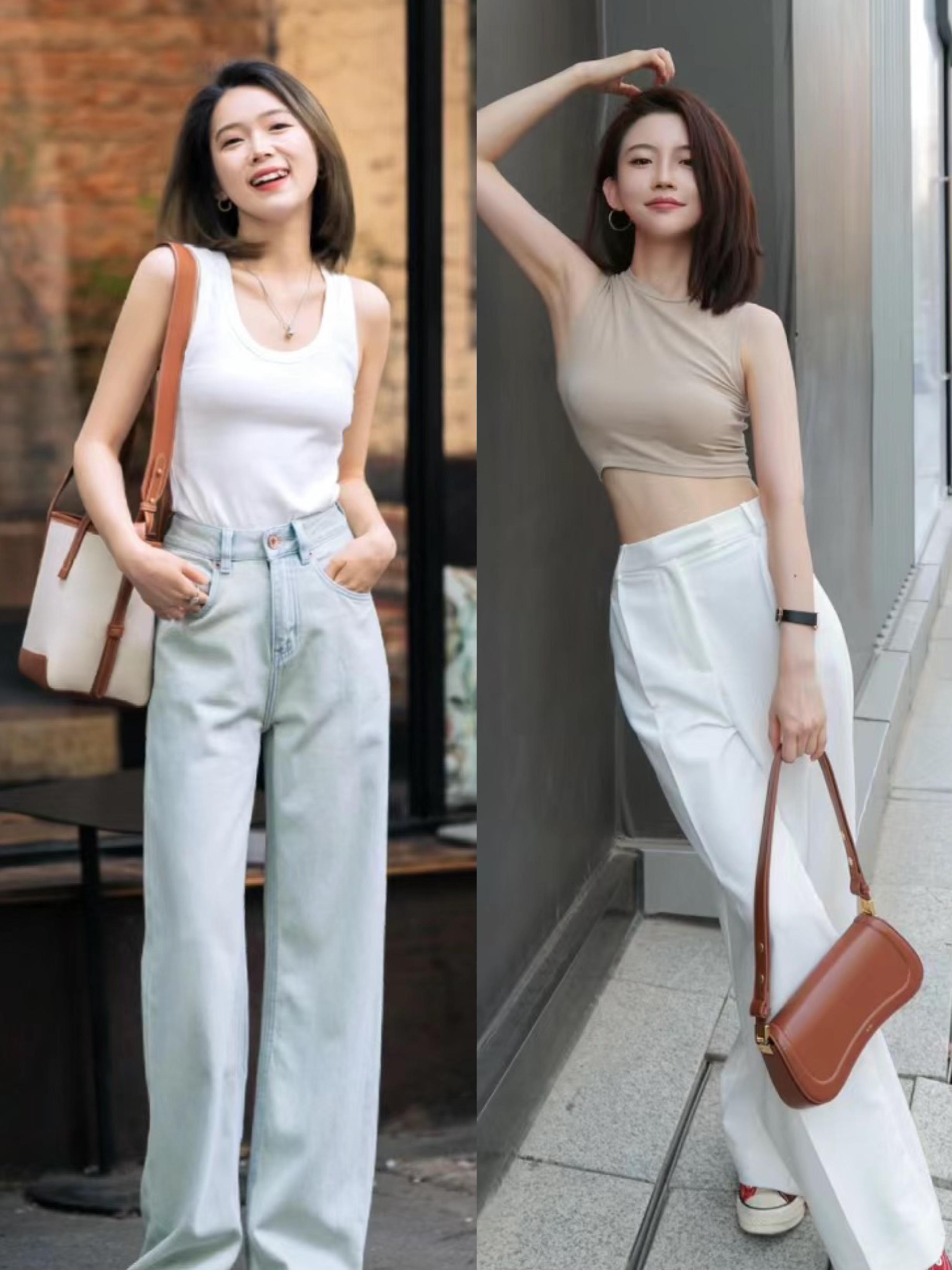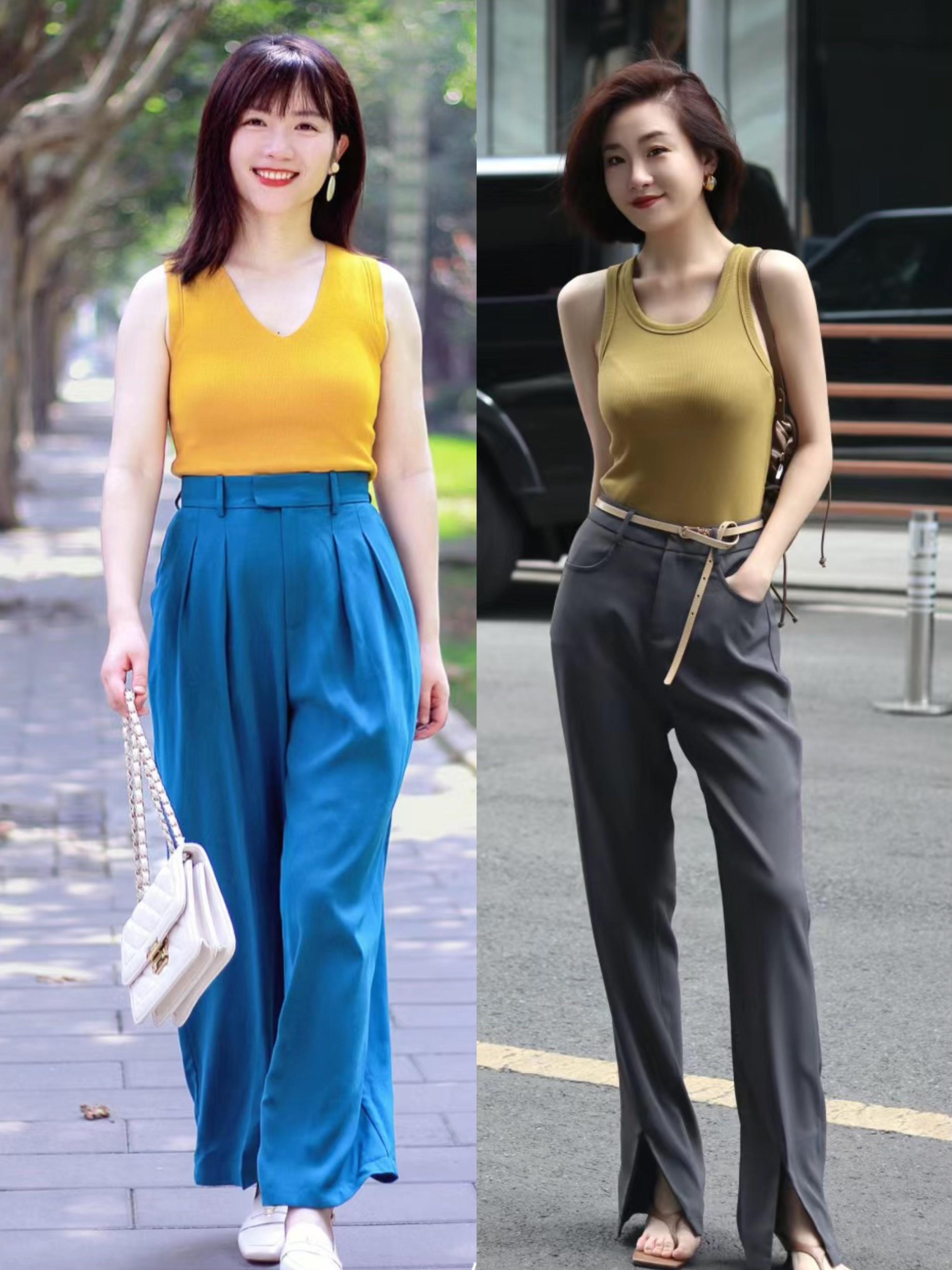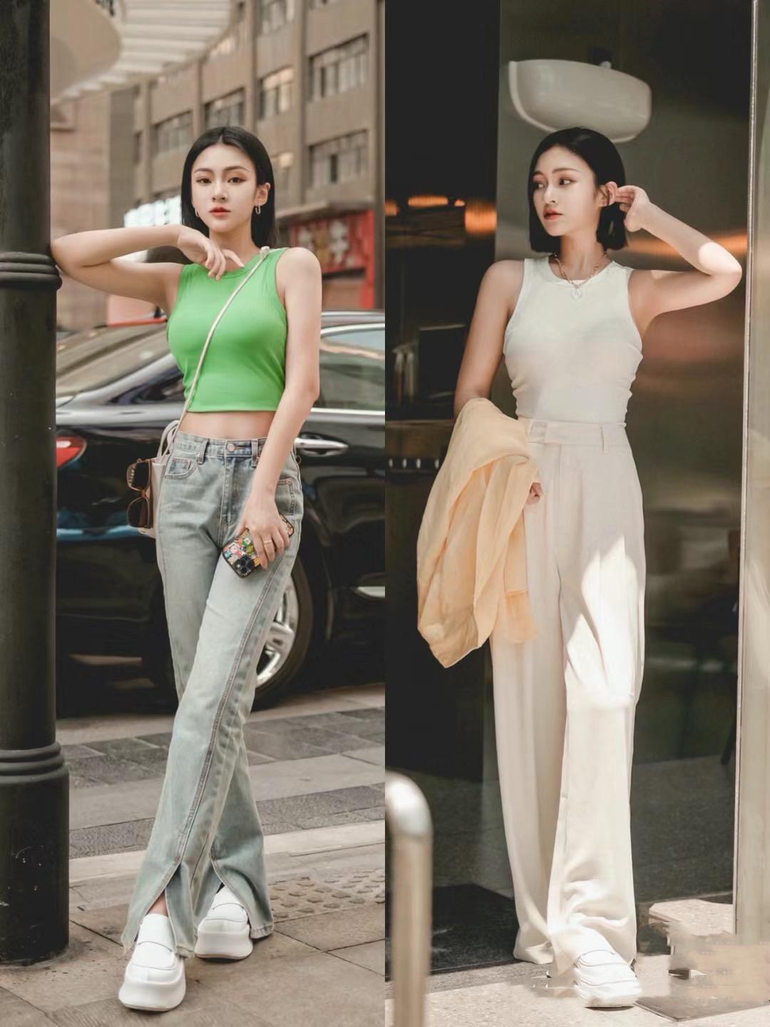 色彩醒目的小背心,儘量搭配低飽和度、高亮度的顏色,有一種溫柔又洋氣的效果。用色彩醒目的小背心來搭配高腰的闊腿牛仔褲,更適合梨形身材。