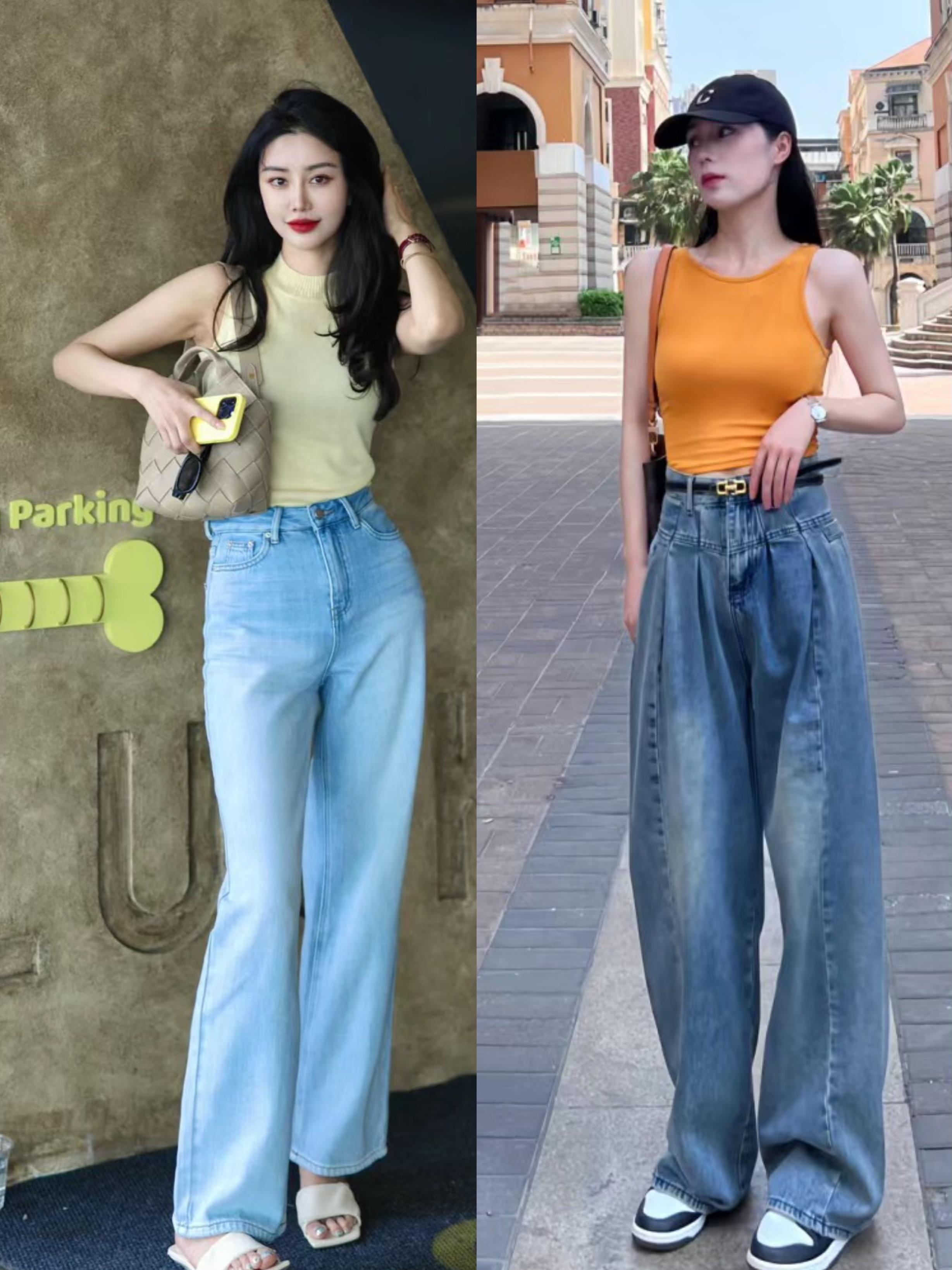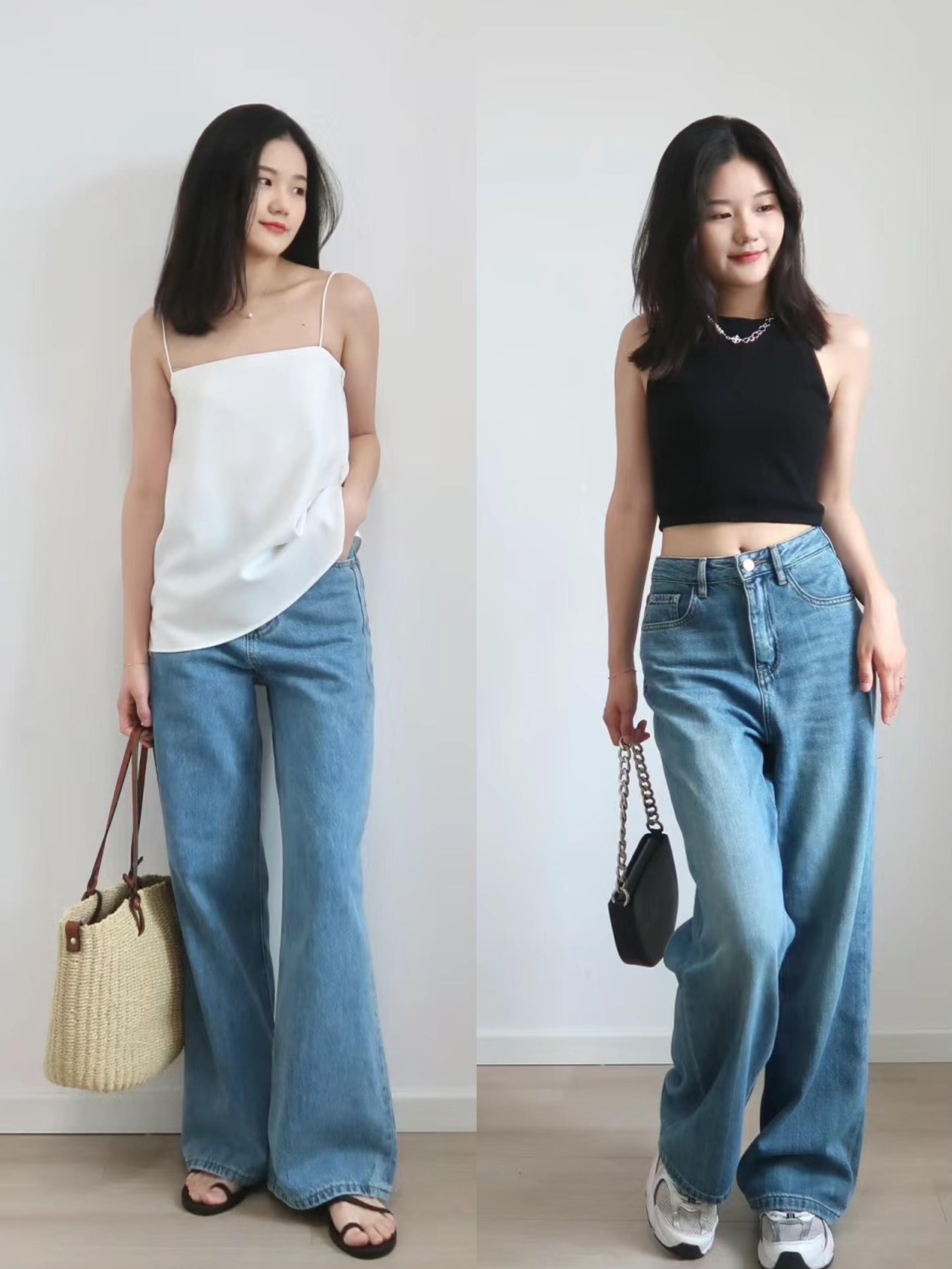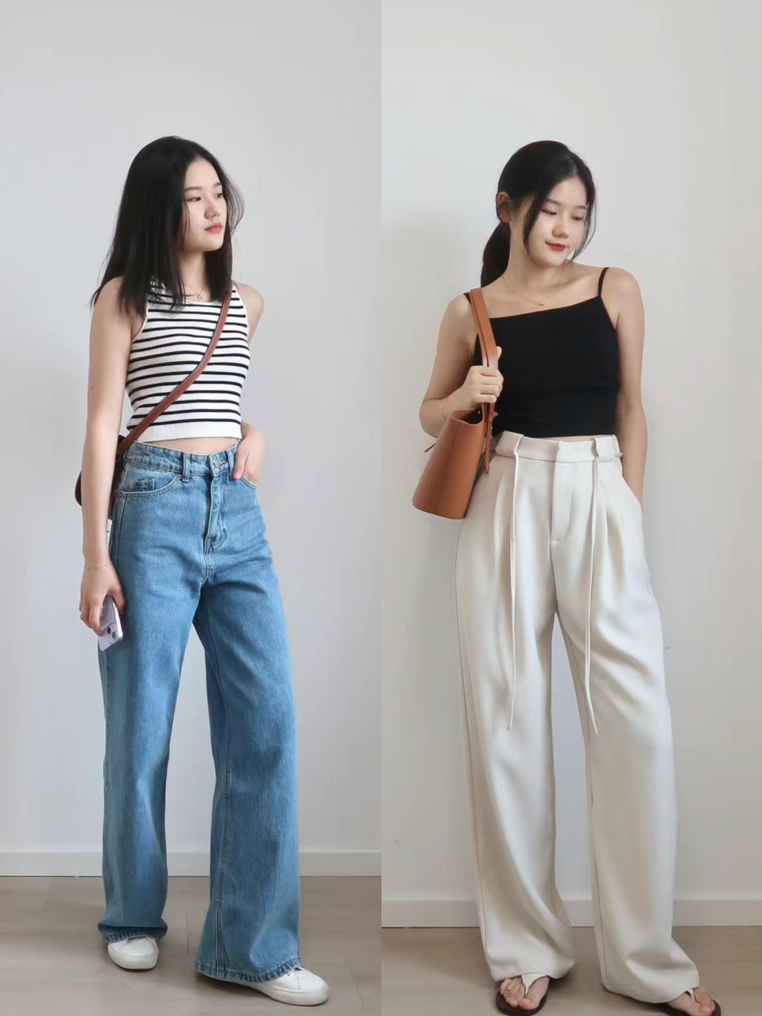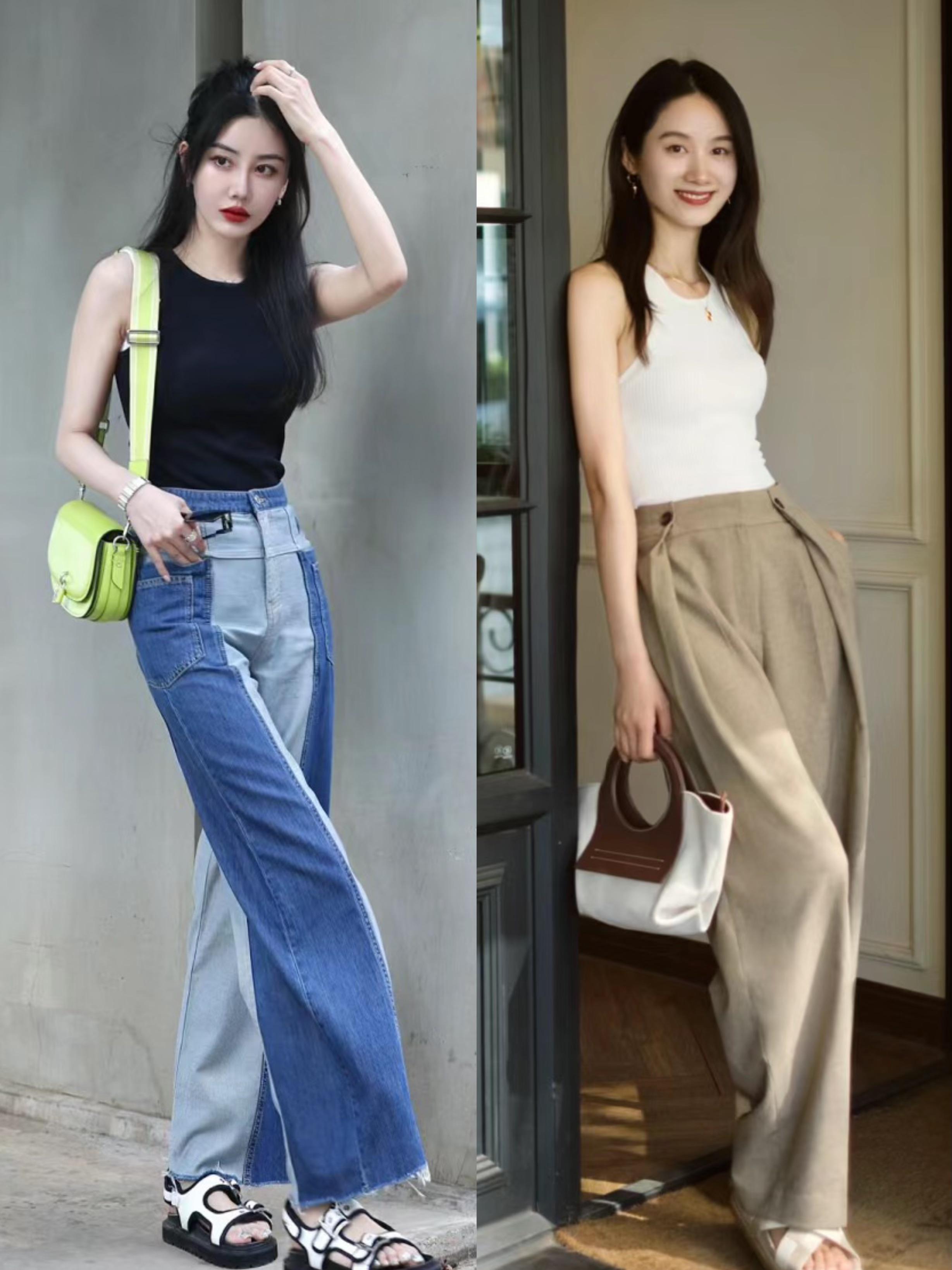 色彩醒目的小背心,儘量搭配低飽和度、高亮度的顏色,有一種溫柔又洋氣的效果。用色彩醒目的小背心來搭配高腰的闊腿牛仔褲,更適合梨形身材。