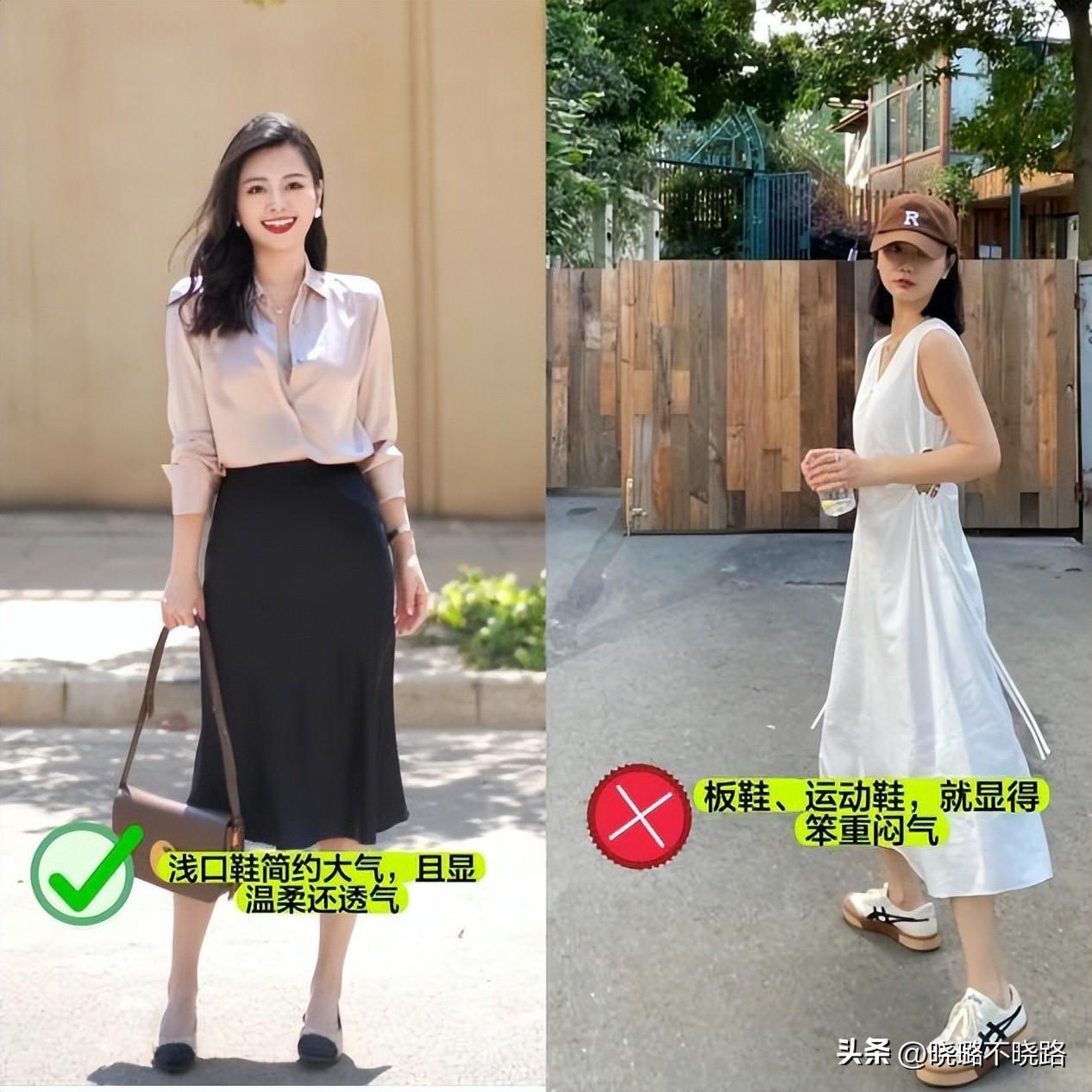 與裙裝搭配的平底鞋其實是不推薦大家選擇板鞋這一類休閒感比較明顯的類型呢,還是簡約大氣感設計的淺口鞋會更好搭配一些的,且從視覺到氣質的感官效果更明顯的,淺口鞋的搭配也能夠很明顯的拉長下半身的局部縱向比例,真的很適合在夏季當中優選起來進行搭配啦!