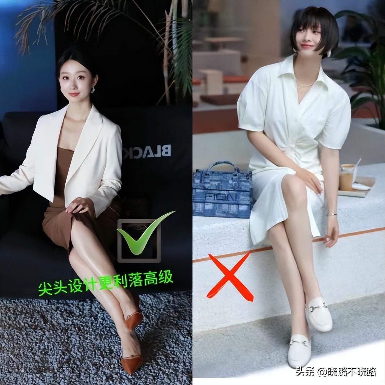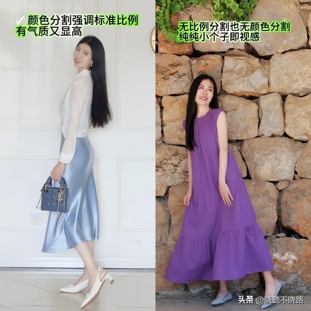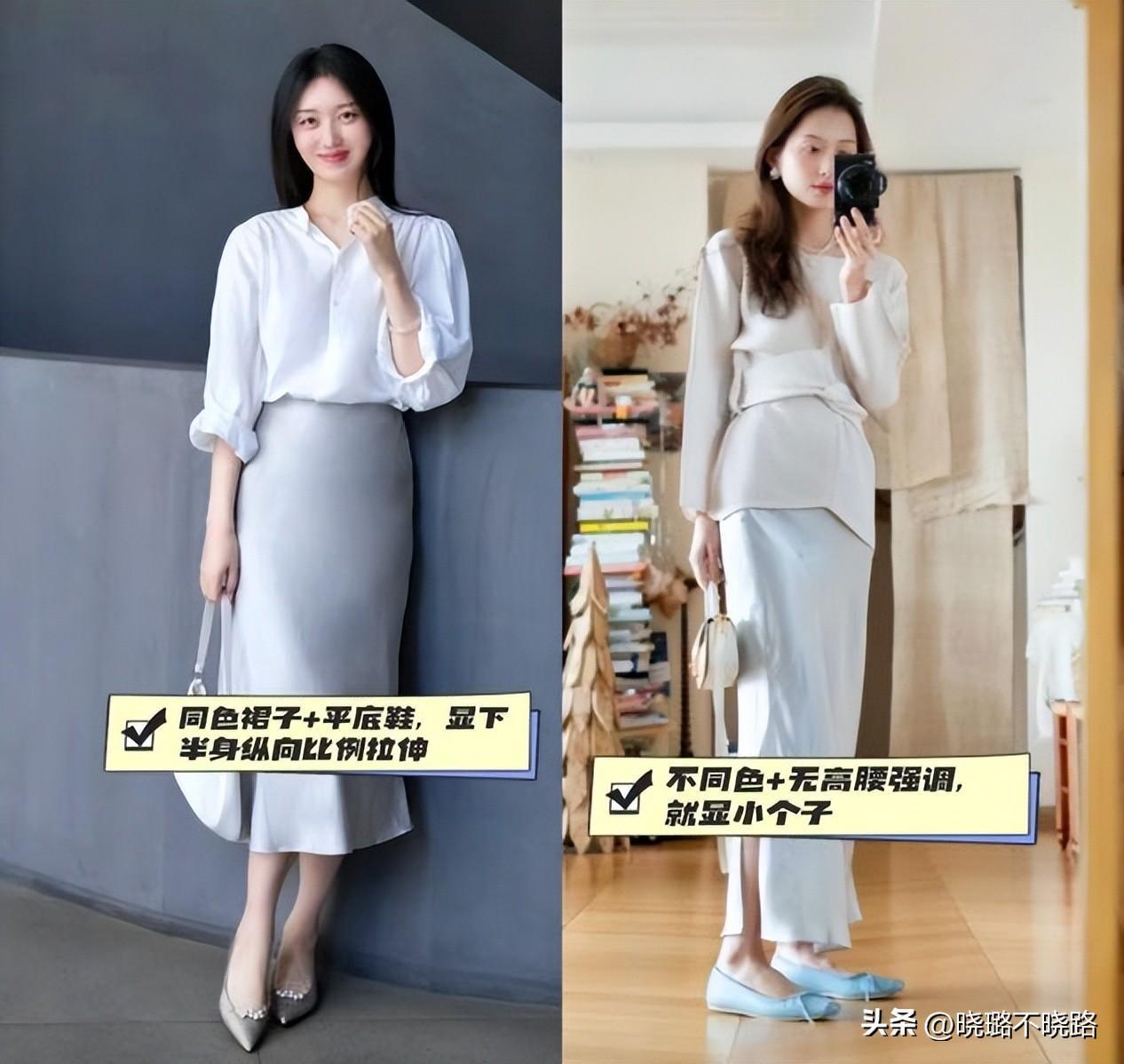如果你本身個子比較小或者腿型比較短一些的話,那麼建議大家在選擇裙裝的時候還是要偏向於垂感較重一些,又或者直接搭配直筒的煙管裙呢,而與之結合起來的平底鞋也一定要是尖頭的設計,這樣的組合下半身的線條非常的流暢連貫且很明顯可以被拉長。