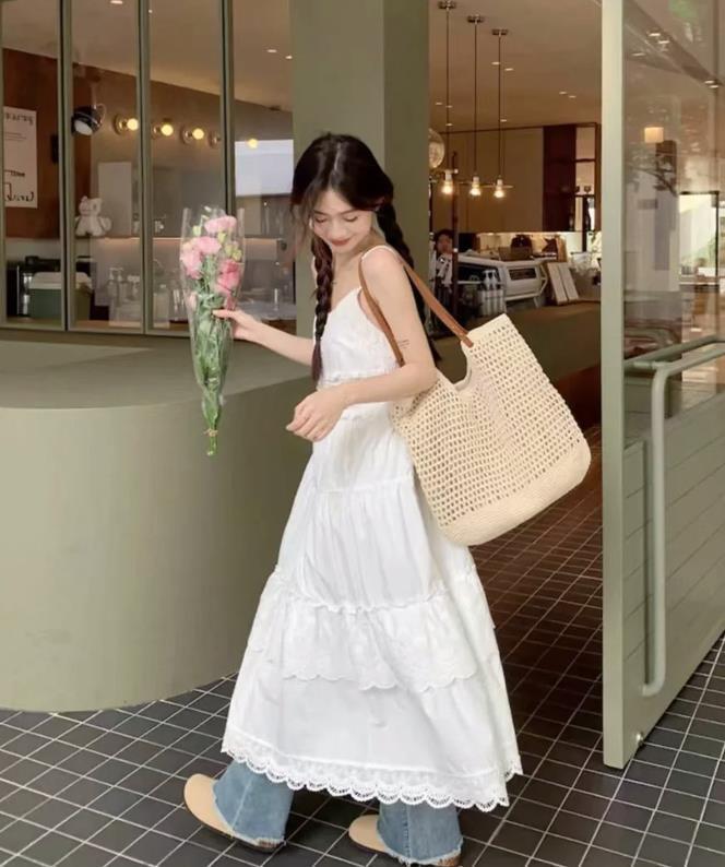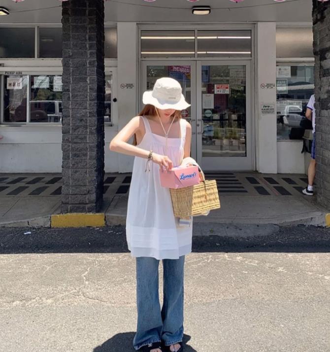 吊帶裙和牛仔褲真的很夏天呢,白色乾淨的吊帶裙+牛仔直筒褲,這種褲型,穿起來不僅顯瘦,還藏肉,經典的款式,與任何一種上衣相配都是沒有問題的啦。另外,增加一些配飾進行點綴,整體的效果會更好,精緻又不失時髦。