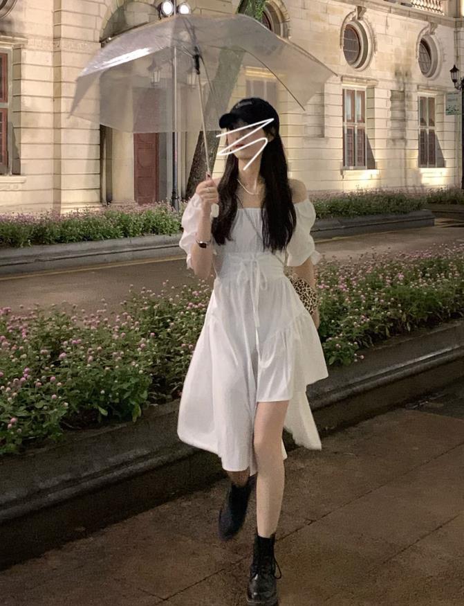 這個夏天,就應該爲自己入手一條白色連衣裙,裙襬不規則的設計,在視覺上就能很好拉長腿部線條,領口是鬆緊的,可以弄成一字肩也是可以的。