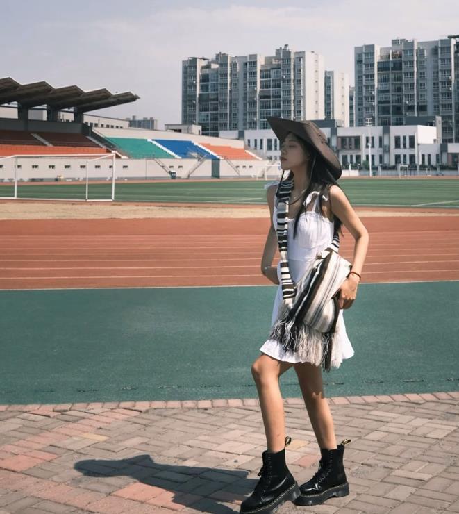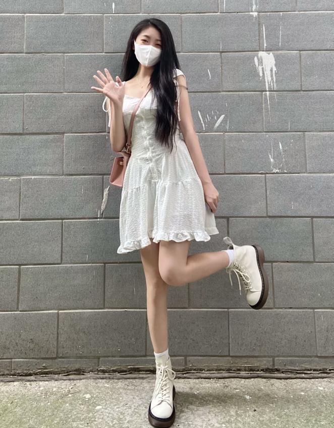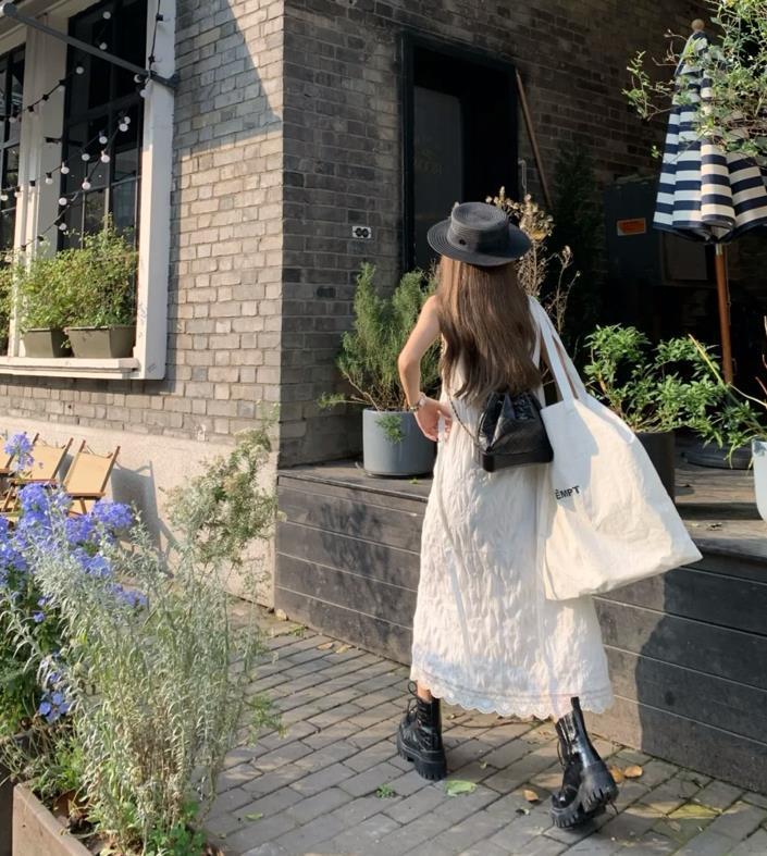 誰懂啊,白裙子+馬丁靴真的好看炸了,吊帶款式的白裙子,最適合炎熱的夏季了,上半身比例好的姐妹,就是要大膽穿起來。清爽涼快又時髦,黑色馬丁靴、黑色包包和帽子,這些單品進行了呼應,讓整個配色更加協調了。
