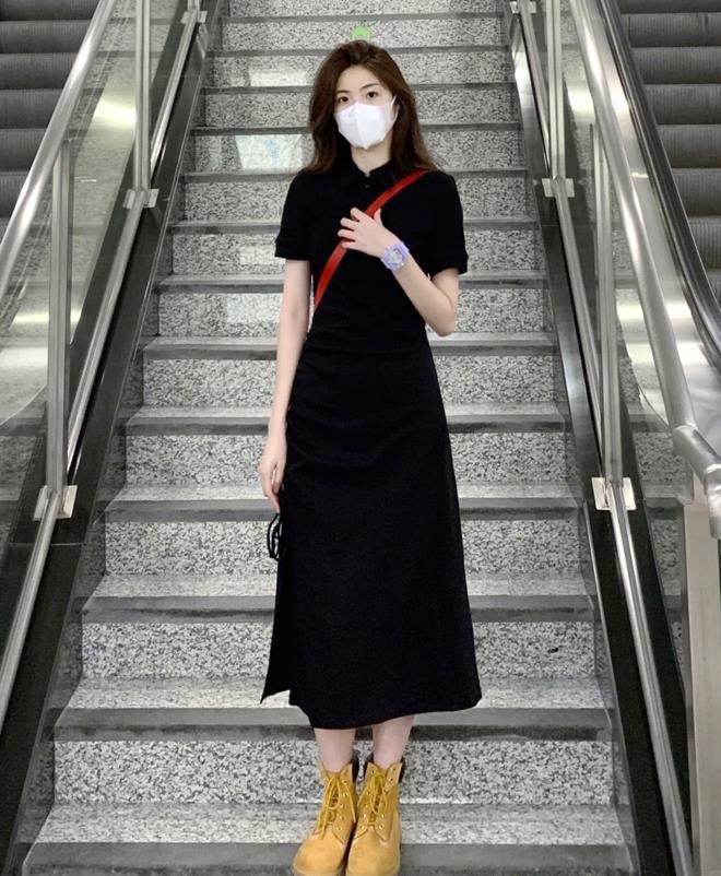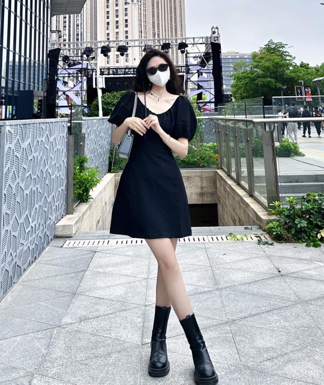誰說黑色的裙子在夏季穿起來就很悶熱呢?完全沒有這回事,簡約又大方的黑色連衣裙,搭配黃色馬丁靴,巨顯瘦又好看的,裙子的長度剛好,露出一點腿部肌膚,在視覺有助於拉長腿部線條。