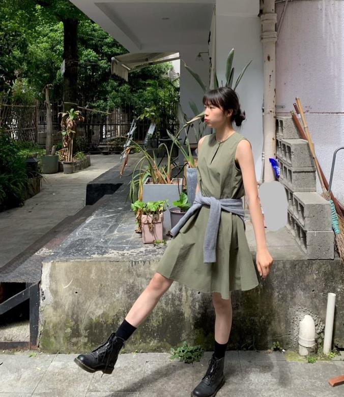 比較顯中性的綠色無袖連衣裙,莫名就覺得這個顏色很酷,a字大裙襬,帶着一點可愛,最重要的是能隱藏起大腿粗以及胯寬的缺點,選擇了黑色馬丁靴相配,整體看起來就很有俏皮範。