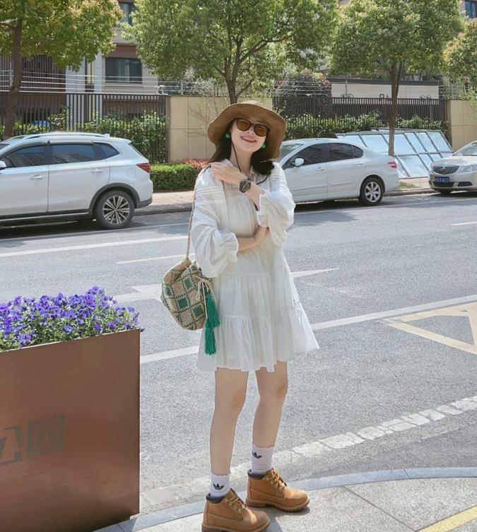 聽說小白裙配大黃靴很火,這種穿搭只有穿過才知道到底有多好看,白色連衣裙,材質輕薄透氣又舒適,雖然是長袖,但在夏季依舊是可以穿的,完全不會讓人覺得悶熱。利用襪子外露製造出層次感,也提升了時髦度,又甜又酷的,絕了。