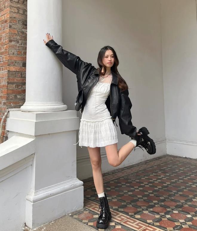 適合春夏季節的穿搭,這個可以肆意露腿的季節,實在是太快樂了,馬丁靴+小白裙+皮衣,帥氣又不失俏皮感。黑白配色組合,是永不出錯的,在早春,出門記得披上外套,炎熱的夏季,就可以脫掉,光是小白裙配馬丁靴的組合,也是超讚的。