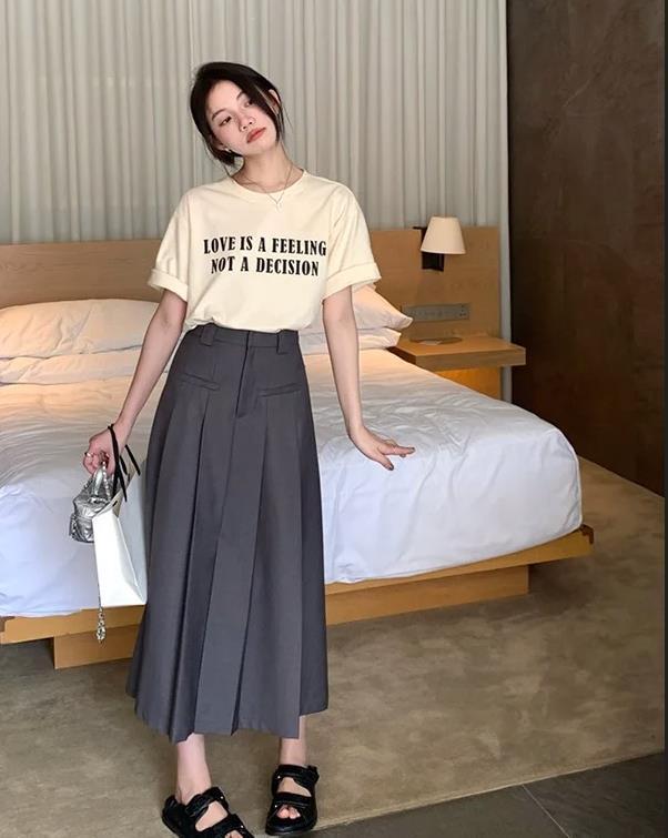 簡約卻不失單調的字母t恤,比起純色系的款式,這種帶點印花圖案的要時髦很多,圓領的設計,方便穿脫,純棉的材質,親膚舒適又不會讓人覺得悶熱。選擇一條灰色百褶半裙相配,瞬間就多了幾分溫柔與優雅。