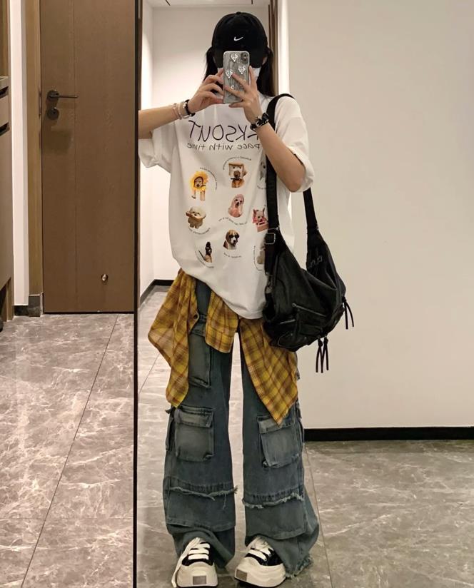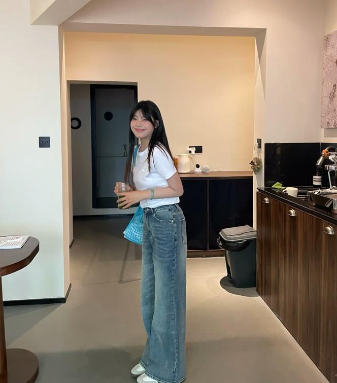 很喜歡這種少女範的帥氣穿搭啊,乾淨的白色t恤,上面還有着趣味十足的印花圖案,實在是太有趣時髦了。下裝配的是一條牛仔闊腿褲,腰間增加了一條格子襯衫進行點綴,不僅增加了層次感,還多了幾分隨性自在。