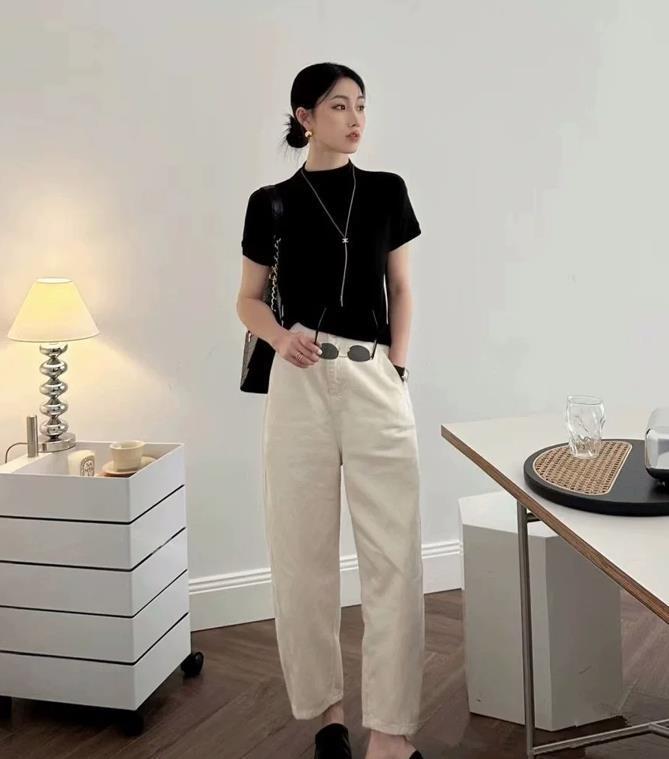 夏天穿黑色和悶熱?你只要懂得配色就可以減輕這種情況,半高領設計,時尚又不失優雅,寬鬆的版型,加上經典的黑色,遮肉顯瘦。搭配白色牛仔九分褲,有種極簡的高級感,增加一些配飾點綴,會更添精緻。